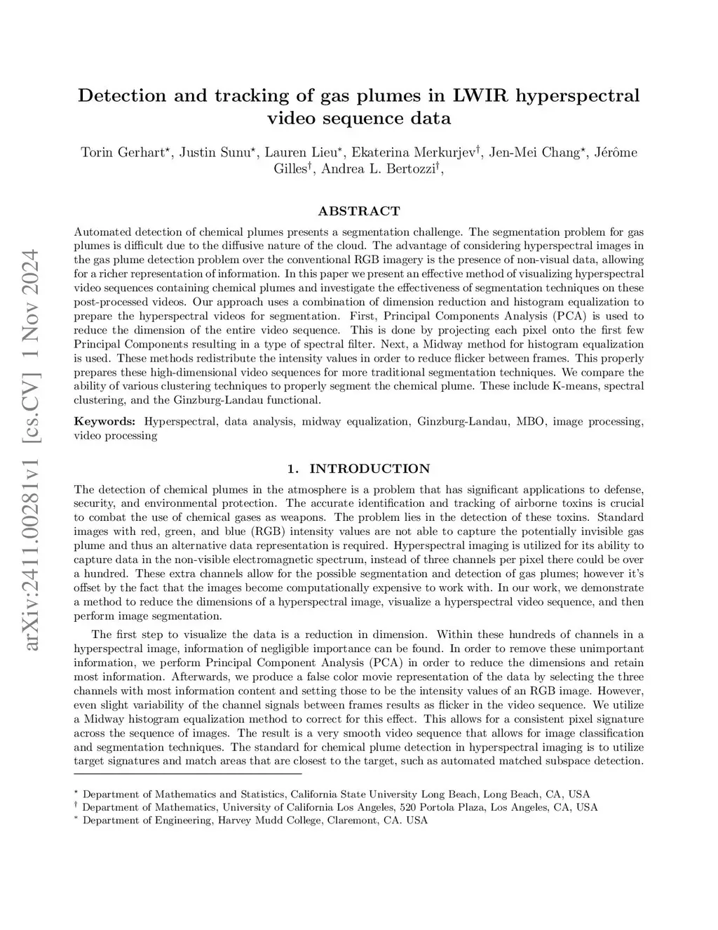 Automated detection of chemical plumes presents a segmentation challenge. The segmentation problem for gas plumes is difficult due to the diffusive nature of the cloud. The advantage of considering hyperspectral images in the gas plume detection problem over the conventional RGB imagery is the presence of non-visual data, allowing for a richer representation of information. In this paper we present an effective method of visualizing hyperspectral video sequences containing chemical plumes and investigate the effectiveness of segmentation techniques on these post-processed videos. Our approach uses a combination of dimension reduction and histogram equalization to prepare the hyperspectral videos for segmentation. First, Principal Components Analysis (PCA) is used to reduce the dimension of the entire video sequence. This is done by projecting each pixel onto the first few Principal Components resulting in a type of spectral filter. Next, a Midway method for histogram equalization is used. These methods redistribute the intensity values in order to reduce flicker between frames. This properly prepares these high-dimensional video sequences for more traditional segmentation techniques. We compare the ability of various clustering techniques to properly segment the chemical plume. These include K-means, spectral clustering, and the Ginzburg-Landau functional.