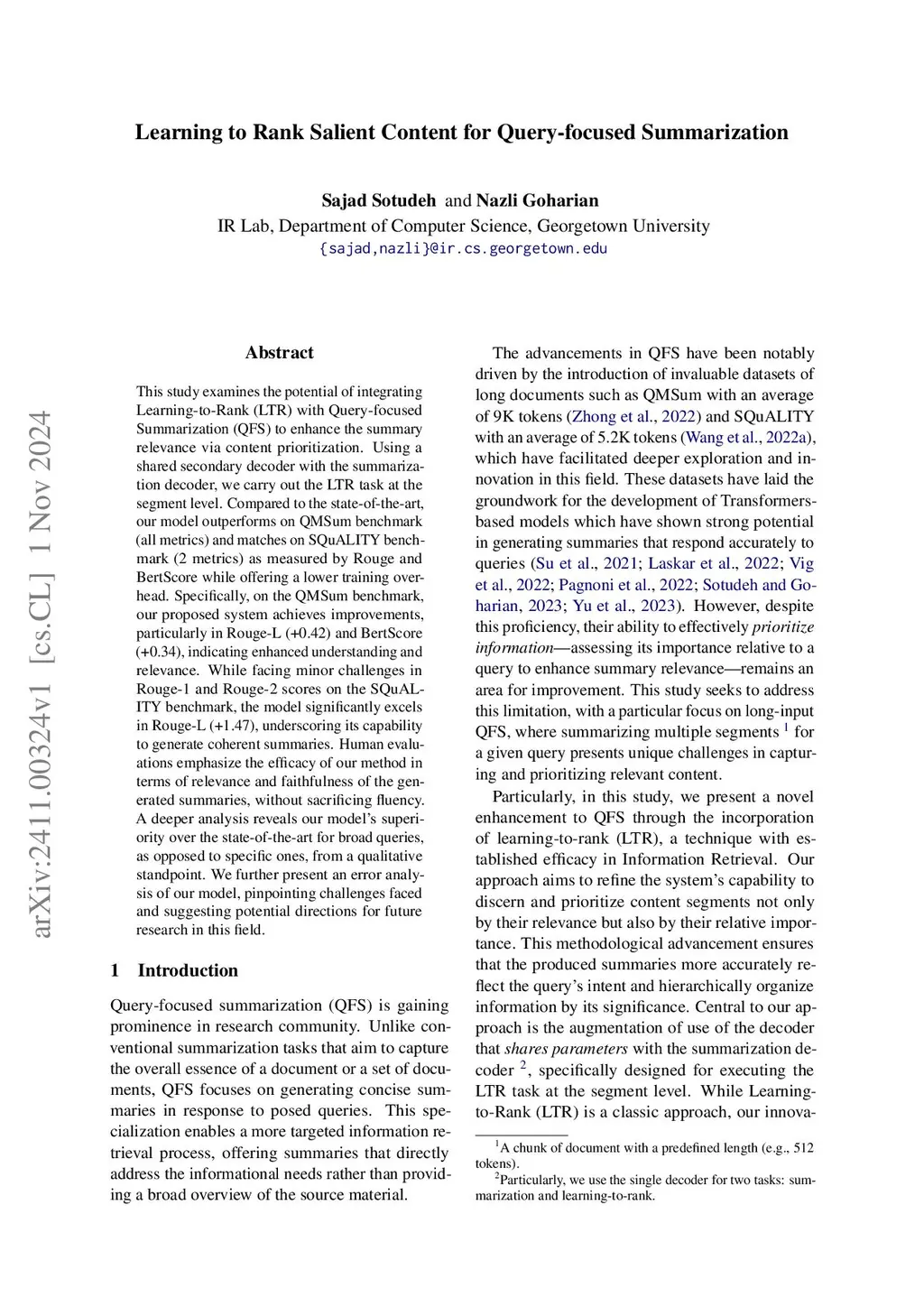 This study examines the potential of integrating Learning-to-Rank (LTR) with Query-focused Summarization (QFS) to enhance the summary relevance via content prioritization. Using a shared secondary decoder with the summarization decoder, we carry out the LTR task at the segment level. Compared to the state-of-the-art, our model outperforms on QMSum benchmark (all metrics) and matches on SQuALITY benchmark (2 metrics) as measured by Rouge and BertScore while offering a lower training overhead. Specifically, on the QMSum benchmark, our proposed system achieves improvements, particularly in Rouge-L (+0.42) and BertScore (+0.34), indicating enhanced understanding and relevance. While facing minor challenges in Rouge-1 and Rouge-2 scores on the SQuALITY benchmark, the model significantly excels in Rouge-L (+1.47), underscoring its capability to generate coherent summaries. Human evaluations emphasize the efficacy of our method in terms of relevance and faithfulness of the generated summaries, without sacrificing fluency. A deeper analysis reveals our model's superiority over the state-of-the-art for broad queries, as opposed to specific ones, from a qualitative standpoint. We further present an error analysis of our model, pinpointing challenges faced and suggesting potential directions for future research in this field.