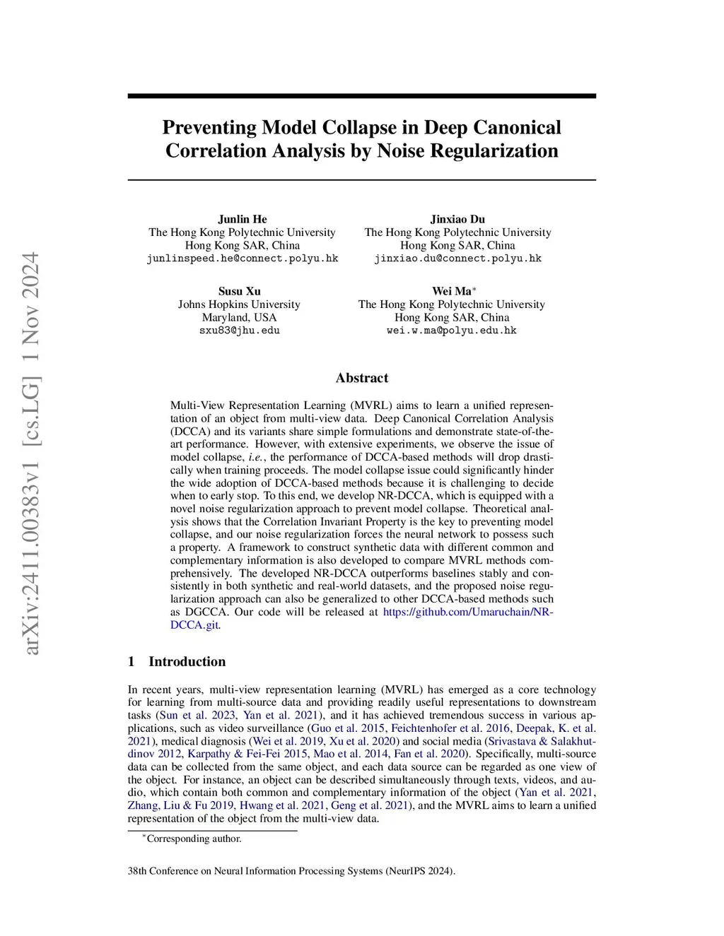 Multi-View Representation Learning (MVRL) aims to learn a unified representation of an object from multi-view data. Deep Canonical Correlation Analysis (DCCA) and its variants share simple formulations and demonstrate state-of-the-art performance. However, with extensive experiments, we observe the issue of model collapse, {\em i.e.}, the performance of DCCA-based methods will drop drastically when training proceeds. The model collapse issue could significantly hinder the wide adoption of DCCA-based methods because it is challenging to decide when to early stop. To this end, we develop NR-DCCA, which is equipped with a novel noise regularization approach to prevent model collapse. Theoretical analysis shows that the Correlation Invariant Property is the key to preventing model collapse, and our noise regularization forces the neural network to possess such a property. A framework to construct synthetic data with different common and complementary information is also developed to compare MVRL methods comprehensively. The developed NR-DCCA outperforms baselines stably and consistently in both synthetic and real-world datasets, and the proposed noise regularization approach can also be generalized to other DCCA-based methods such as DGCCA.