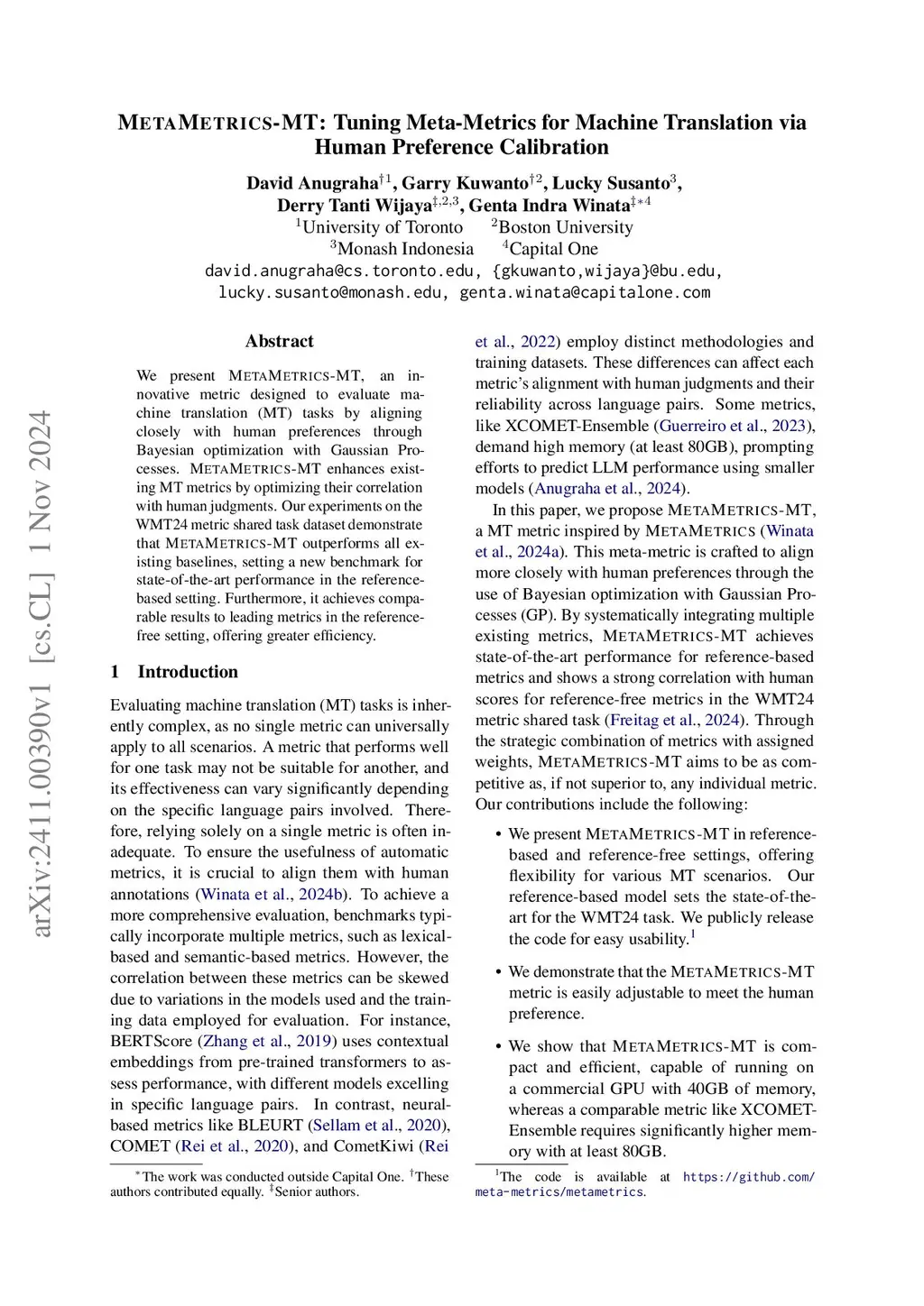 We present MetaMetrics-MT, an innovative metric designed to evaluate machine translation (MT) tasks by aligning closely with human preferences through Bayesian optimization with Gaussian Processes. MetaMetrics-MT enhances existing MT metrics by optimizing their correlation with human judgments. Our experiments on the WMT24 metric shared task dataset demonstrate that MetaMetrics-MT outperforms all existing baselines, setting a new benchmark for state-of-the-art performance in the reference-based setting. Furthermore, it achieves comparable results to leading metrics in the reference-free setting, offering greater efficiency.