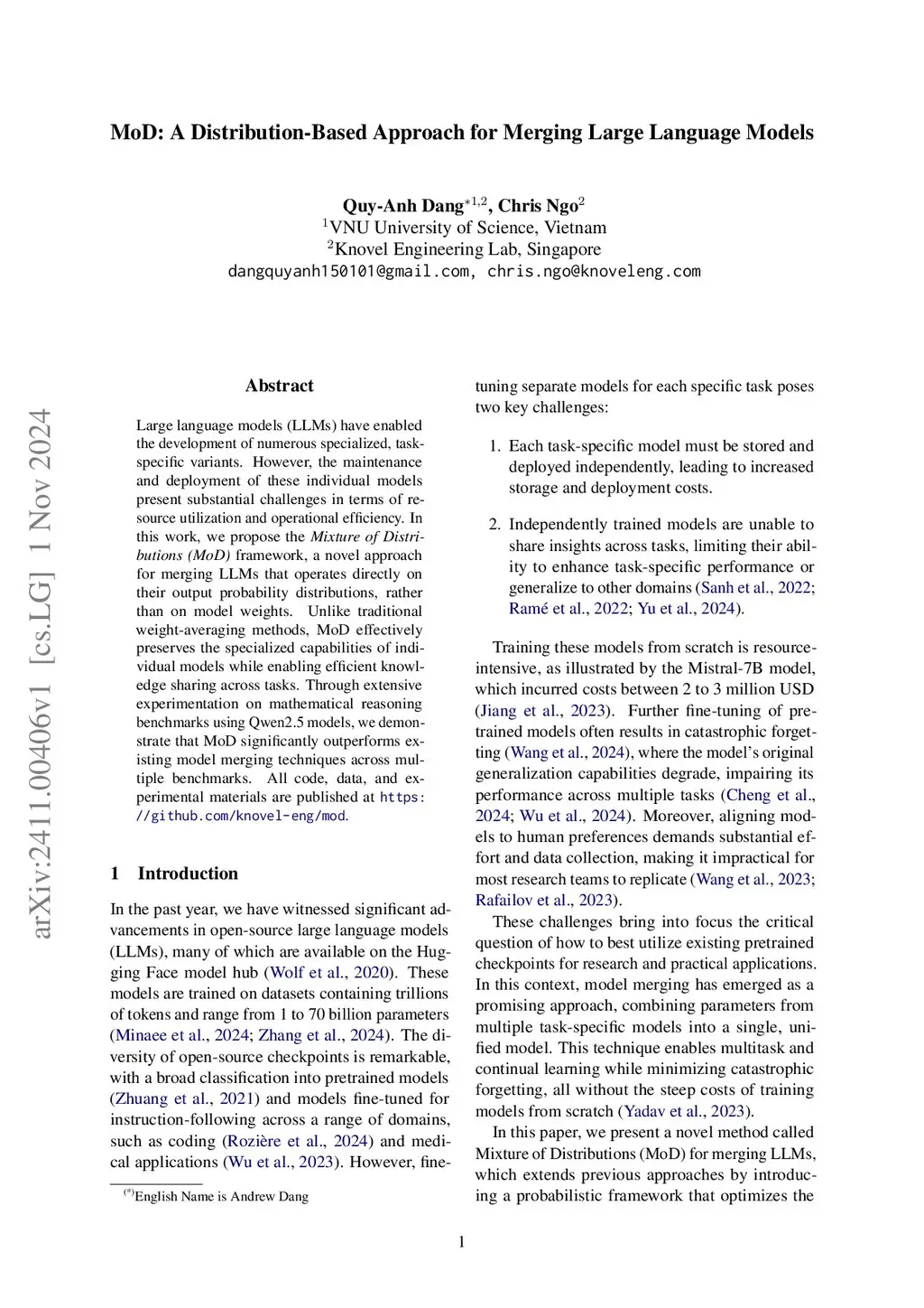 MoD: A Distribution-Based Approach for Merging Large Language Models
