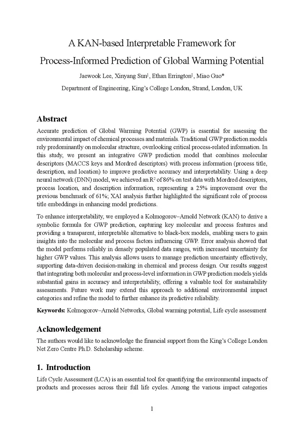 Accurate prediction of Global Warming Potential (GWP) is essential for assessing the environmental impact of chemical processes and materials. Traditional GWP prediction models rely predominantly on molecular structure, overlooking critical process-related information. In this study, we present an integrative GWP prediction model that combines molecular descriptors (MACCS keys and Mordred descriptors) with process information (process title, description, and location) to improve predictive accuracy and interpretability. Using a deep neural network (DNN) model, we achieved an R-squared of 86% on test data with Mordred descriptors, process location, and description information, representing a 25% improvement over the previous benchmark of 61%; XAI analysis further highlighted the significant role of process title embeddings in enhancing model predictions. To enhance interpretability, we employed a Kolmogorov-Arnold Network (KAN) to derive a symbolic formula for GWP prediction, capturing key molecular and process features and providing a transparent, interpretable alternative to black-box models, enabling users to gain insights into the molecular and process factors influencing GWP. Error analysis showed that the model performs reliably in densely populated data ranges, with increased uncertainty for higher GWP values. This analysis allows users to manage prediction uncertainty effectively, supporting data-driven decision-making in chemical and process design. Our results suggest that integrating both molecular and process-level information in GWP prediction models yields substantial gains in accuracy and interpretability, offering a valuable tool for sustainability assessments. Future work may extend this approach to additional environmental impact categories and refine the model to further enhance its predictive reliability.