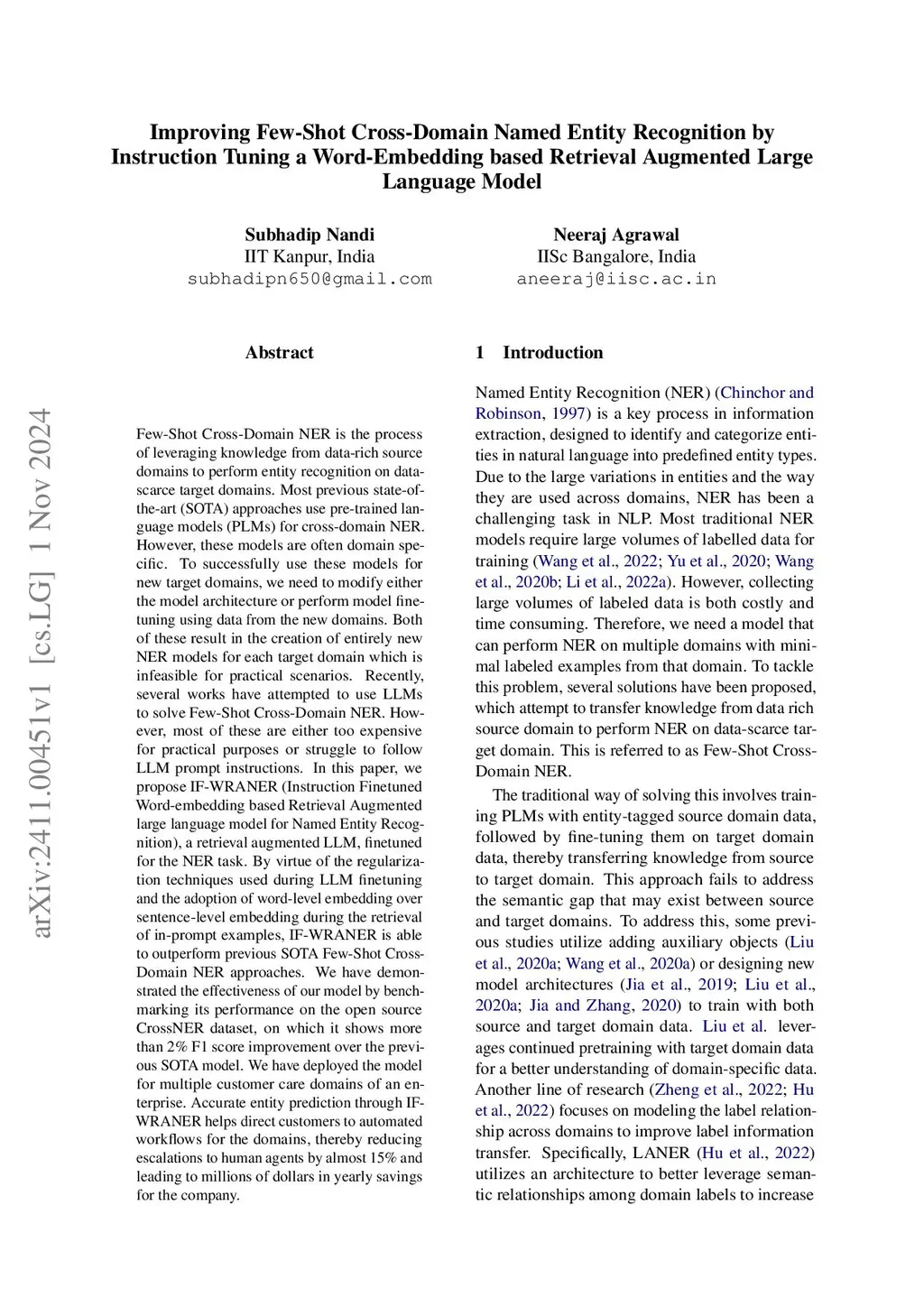 Few-Shot Cross-Domain NER is the process of leveraging knowledge from data-rich source domains to perform entity recognition on data scarce target domains. Most previous state-of-the-art (SOTA) approaches use pre-trained language models (PLMs) for cross-domain NER. However, these models are often domain specific. To successfully use these models for new target domains, we need to modify either the model architecture or perform model finetuning using data from the new domains. Both of these result in the creation of entirely new NER models for each target domain which is infeasible for practical scenarios. Recently,several works have attempted to use LLMs to solve Few-Shot Cross-Domain NER. However, most of these are either too expensive for practical purposes or struggle to follow LLM prompt instructions. In this paper, we propose IF-WRANER (Instruction Finetuned Word-embedding based Retrieval Augmented large language model for Named Entity Recognition), a retrieval augmented LLM, finetuned for the NER task. By virtue of the regularization techniques used during LLM finetuning and the adoption of word-level embedding over sentence-level embedding during the retrieval of in-prompt examples, IF-WRANER is able to outperform previous SOTA Few-Shot Cross-Domain NER approaches. We have demonstrated the effectiveness of our model by benchmarking its performance on the open source CrossNER dataset, on which it shows more than 2% F1 score improvement over the previous SOTA model. We have deployed the model for multiple customer care domains of an enterprise. Accurate entity prediction through IF-WRANER helps direct customers to automated workflows for the domains, thereby reducing escalations to human agents by almost 15% and leading to millions of dollars in yearly savings for the company.
