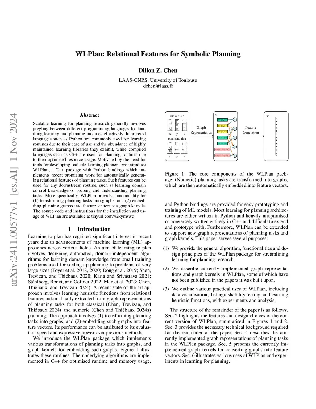 Scalable learning for planning research generally involves juggling between different programming languages for handling learning and planning modules effectively. Interpreted languages such as Python are commonly used for learning routines due to their ease of use and the abundance of highly maintained learning libraries they exhibit, while compiled languages such as C++ are used for planning routines due to their optimised resource usage. Motivated by the need for tools for developing scalable learning planners, we introduce WLPlan, a C++ package with Python bindings which implements recent promising work for automatically generating relational features of planning tasks. Such features can be used for any downstream routine, such as learning domain control knowledge or probing and understanding planning tasks. More specifically, WLPlan provides functionality for (1) transforming planning tasks into graphs, and (2) embedding planning graphs into feature vectors via graph kernels. The source code and instructions for the installation and usage of WLPlan are available at tinyurl.com/42kymswc