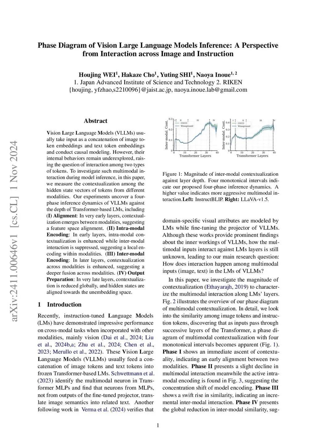 Vision Large Language Models (VLLMs) usually take input as a concatenation of image token embeddings and text token embeddings and conduct causal modeling. However, their internal behaviors remain underexplored, raising the question of interaction among two types of tokens. To investigate such multimodal interaction during model inference, in this paper, we measure the contextualization among the hidden state vectors of tokens from different modalities. Our experiments uncover a four-phase inference dynamics of VLLMs against the depth of Transformer-based LMs, including (I) Alignment: In very early layers, contextualization emerges between modalities, suggesting a feature space alignment. (II) Intra-modal Encoding: In early layers, intra-modal contextualization is enhanced while inter-modal interaction is suppressed, suggesting a local encoding within modalities. (III) Inter-modal Encoding: In later layers, contextualization across modalities is enhanced, suggesting a deeper fusion across modalities. (IV) Output Preparation: In very late layers, contextualization is reduced globally, and hidden states are aligned towards the unembedding space.