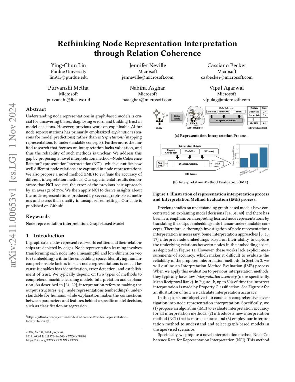 Understanding node representations in graph-based models is crucial for uncovering biases ,diagnosing errors, and building trust in model decisions. However, previous work on explainable AI for node representations has primarily emphasized explanations (reasons for model predictions) rather than interpretations (mapping representations to understandable concepts). Furthermore, the limited research that focuses on interpretation lacks validation, and thus the reliability of such methods is unclear. We address this gap by proposing a novel interpretation method-Node Coherence Rate for Representation Interpretation (NCI)-which quantifies how well different node relations are captured in node representations. We also propose a novel method (IME) to evaluate the accuracy of different interpretation methods. Our experimental results demonstrate that NCI reduces the error of the previous best approach by an average of 39%. We then apply NCI to derive insights about the node representations produced by several graph-based methods and assess their quality in unsupervised settings.