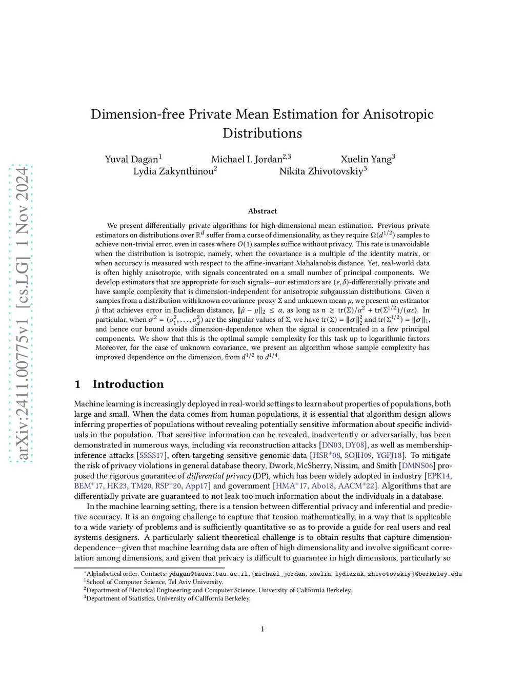 We present differentially private algorithms for high-dimensional mean estimation. Previous private estimators on distributions over suffer from a curse of dimensionality, as they require samples to achieve non-trivial error, even in cases where samples suffice without privacy. This rate is unavoidable when the distribution is isotropic, namely, when the covariance is a multiple of the identity matrix, or when accuracy is measured with respect to the affine-invariant Mahalanobis distance. Yet, real-world data is often highly anisotropic, with signals concentrated on a small number of principal components. We develop estimators that are appropriate for such signalsour estimators are -differentially private and have sample complexity that is dimension-independent for anisotropic subgaussian distributions. Given samples from a distribution with known covariance-proxy and unknown mean , we present an estimator that achieves error , as long as . In particular, when are the singular values of , we have and , and hence our bound avoids dimension-dependence when the signal is concentrated in a few principal components. We show that this is the optimal sample complexity for this task up to logarithmic factors. Moreover, for the case of unknown covariance, we present an algorithm whose sample complexity has improved dependence on the dimension, from to .