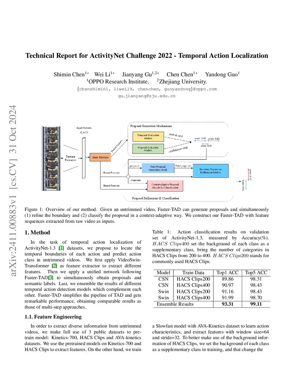 In the task of temporal action localization of ActivityNet-1.3 datasets, we propose to locate the temporal boundaries of each action and predict action class in untrimmed videos. We first apply VideoSwinTransformer as feature extractor to extract different features. Then we apply a unified network following Faster-TAD to simultaneously obtain proposals and semantic labels. Last, we ensemble the results of different temporal action detection models which complement each other. Faster-TAD simplifies the pipeline of TAD and gets remarkable performance, obtaining comparable results as those of multi-step approaches.