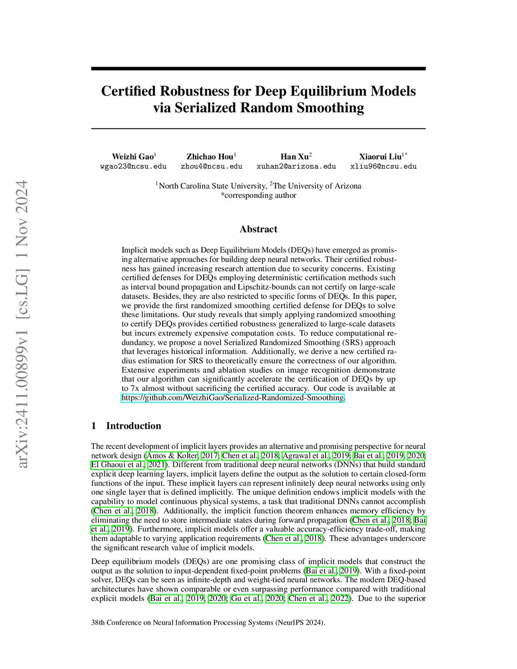 Implicit models such as Deep Equilibrium Models (DEQs) have emerged as promising alternative approaches for building deep neural networks. Their certified robustness has gained increasing research attention due to security concerns. Existing certified defenses for DEQs employing deterministic certification methods such as interval bound propagation and Lipschitz-bounds can not certify on large-scale datasets. Besides, they are also restricted to specific forms of DEQs. In this paper, we provide the first randomized smoothing certified defense for DEQs to solve these limitations. Our study reveals that simply applying randomized smoothing to certify DEQs provides certified robustness generalized to large-scale datasets but incurs extremely expensive computation costs. To reduce computational redundancy, we propose a novel Serialized Randomized Smoothing (SRS) approach that leverages historical information. Additionally, we derive a new certified radius estimation for SRS to theoretically ensure the correctness of our algorithm. Extensive experiments and ablation studies on image recognition demonstrate that our algorithm can significantly accelerate the certification of DEQs by up to 7x almost without sacrificing the certified accuracy. Our code is available at https://github.com/WeizhiGao/Serialized-Randomized-Smoothing.