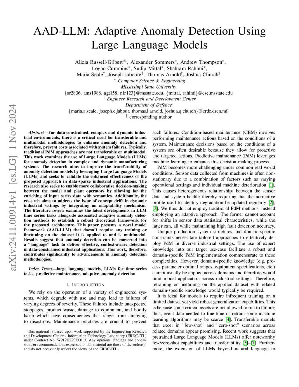 For data-constrained, complex and dynamic industrial environments, there is a critical need for transferable and multimodal methodologies to enhance anomaly detection and therefore, prevent costs associated with system failures. Typically, traditional PdM approaches are not transferable or multimodal. This work examines the use of Large Language Models (LLMs) for anomaly detection in complex and dynamic manufacturing systems. The research aims to improve the transferability of anomaly detection models by leveraging Large Language Models (LLMs) and seeks to validate the enhanced effectiveness of the proposed approach in data-sparse industrial applications. The research also seeks to enable more collaborative decision-making between the model and plant operators by allowing for the enriching of input series data with semantics. Additionally, the research aims to address the issue of concept drift in dynamic industrial settings by integrating an adaptability mechanism. The literature review examines the latest developments in LLM time series tasks alongside associated adaptive anomaly detection methods to establish a robust theoretical framework for the proposed architecture. This paper presents a novel model framework (AAD-LLM) that doesn't require any training or finetuning on the dataset it is applied to and is multimodal. Results suggest that anomaly detection can be converted into a "language" task to deliver effective, context-aware detection in data-constrained industrial applications. This work, therefore, contributes significantly to advancements in anomaly detection methodologies.