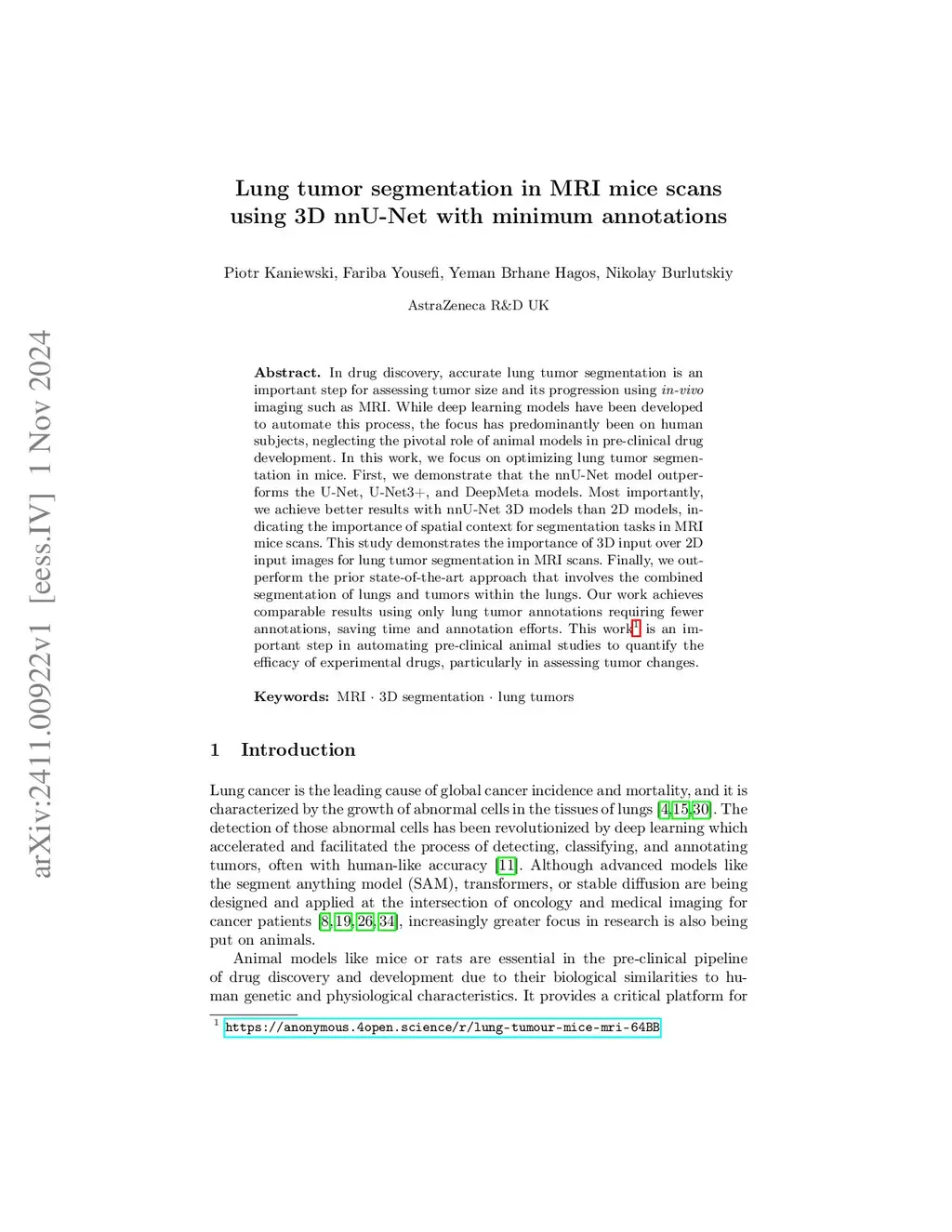 Lung tumor segmentation in MRI mice scans using 3D nnU-Net with minimum