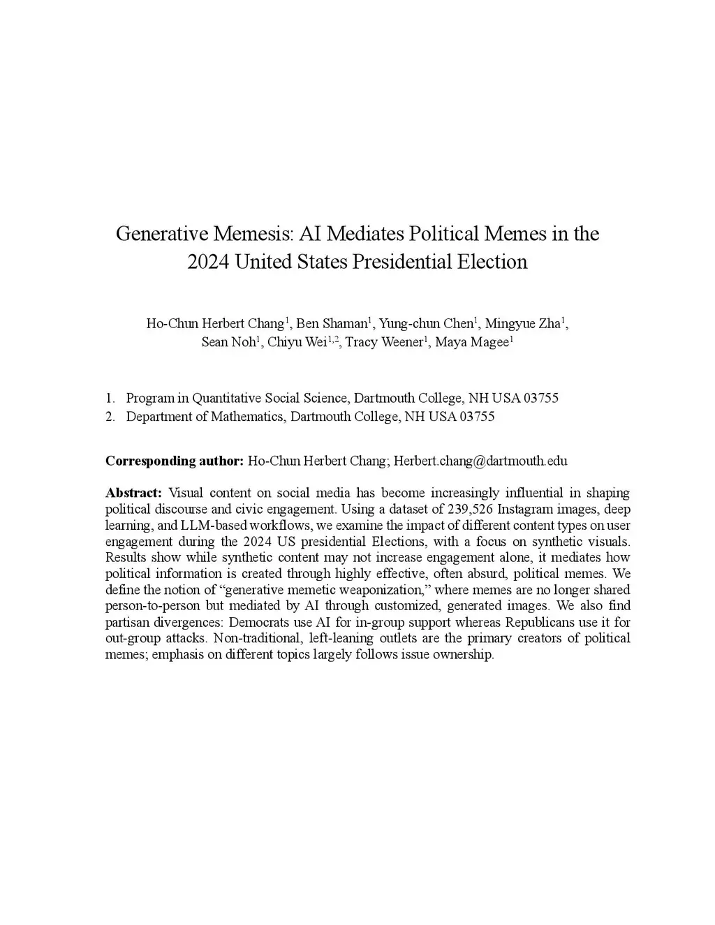 Visual content on social media has become increasingly influential in shaping political discourse and civic engagement. Using a dataset of 239,526 Instagram images, deep learning, and LLM-based workflows, we examine the impact of different content types on user engagement during the 2024 US presidential Elections, with a focus on synthetic visuals. Results show while synthetic content may not increase engagement alone, it mediates how political information is created through highly effective, often absurd, political memes. We define the notion of generative memesis, where memes are no longer shared person-to-person but mediated by AI through customized, generated images. We also find partisan divergences: Democrats use AI for in-group support whereas Republicans use it for out-group attacks. Non-traditional, left-leaning outlets are the primary creators of political memes; emphasis on different topics largely follows issue ownership.