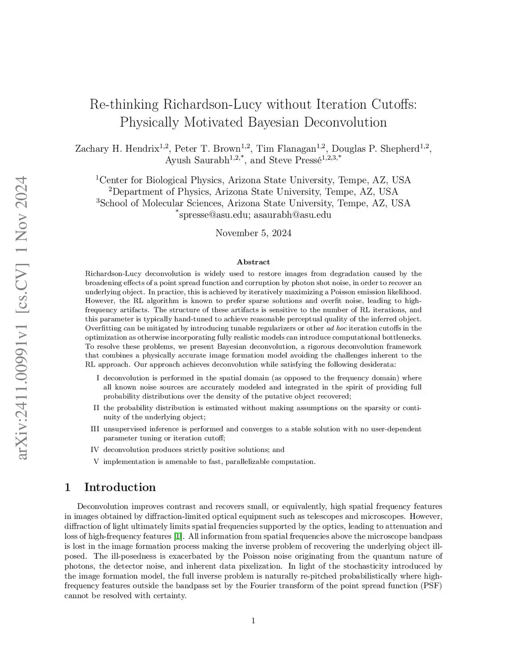 Richardson-Lucy deconvolution is widely used to restore images from degradation caused by the broadening effects of a point spread function and corruption by photon shot noise, in order to recover an underlying object. In practice, this is achieved by iteratively maximizing a Poisson emission likelihood. However, the RL algorithm is known to prefer sparse solutions and overfit noise, leading to high-frequency artifacts. The structure of these artifacts is sensitive to the number of RL iterations, and this parameter is typically hand-tuned to achieve reasonable perceptual quality of the inferred object. Overfitting can be mitigated by introducing tunable regularizers or other ad hoc iteration cutoffs in the optimization as otherwise incorporating fully realistic models can introduce computational bottlenecks. To resolve these problems, we present Bayesian deconvolution, a rigorous deconvolution framework that combines a physically accurate image formation model avoiding the challenges inherent to the RL approach. Our approach achieves deconvolution while satisfying the following desiderata: I deconvolution is performed in the spatial domain (as opposed to the frequency domain) where all known noise sources are accurately modeled and integrated in the spirit of providing full probability distributions over the density of the putative object recovered; II the probability distribution is estimated without making assumptions on the sparsity or continuity of the underlying object; III unsupervised inference is performed and converges to a stable solution with no user-dependent parameter tuning or iteration cutoff; IV deconvolution produces strictly positive solutions; and V implementation is amenable to fast, parallelizable computation.