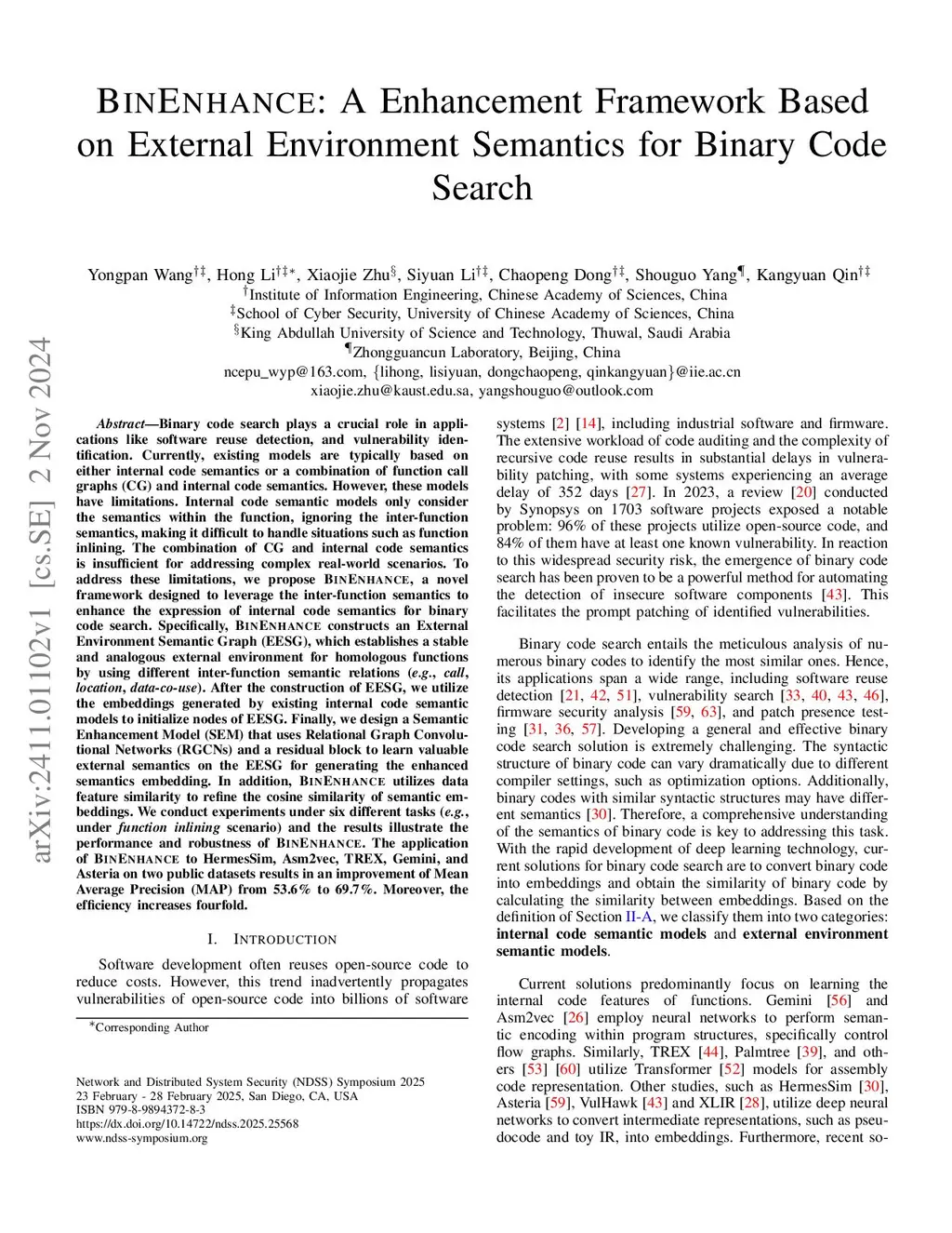 Binary code search plays a crucial role in applications like software reuse detection. Currently, existing models are typically based on either internal code semantics or a combination of function call graphs (CG) and internal code semantics. However, these models have limitations. Internal code semantic models only consider the semantics within the function, ignoring the inter-function semantics, making it difficult to handle situations such as function inlining. The combination of CG and internal code semantics is insufficient for addressing complex real-world scenarios. To address these limitations, we propose BinEnhance, a novel framework designed to leverage the inter-function semantics to enhance the expression of internal code semantics for binary code search. Specifically, BinEnhance constructs an External Environment Semantic Graph (EESG), which establishes a stable and analogous external environment for homologous functions by using different inter-function semantic relations (e.g., call, location, data-co-use). After the construction of EESG, we utilize the embeddings generated by existing internal code semantic models to initialize nodes of EESG. Finally, we design a Semantic Enhancement Model (SEM) that uses Relational Graph Convolutional Networks (RGCNs) and a residual block to learn valuable external semantics on the EESG for generating the enhanced semantics embedding. In addition, BinEnhance utilizes data feature similarity to refine the cosine similarity of semantic embeddings. We conduct experiments under six different tasks (e.g., under function inlining scenario) and the results illustrate the performance and robustness of BinEnhance. The application of BinEnhance to HermesSim, Asm2vec, TREX, Gemini, and Asteria on two public datasets results in an improvement of Mean Average Precision (MAP) from 53.6% to 69.7%. Moreover, the efficiency increases fourfold.