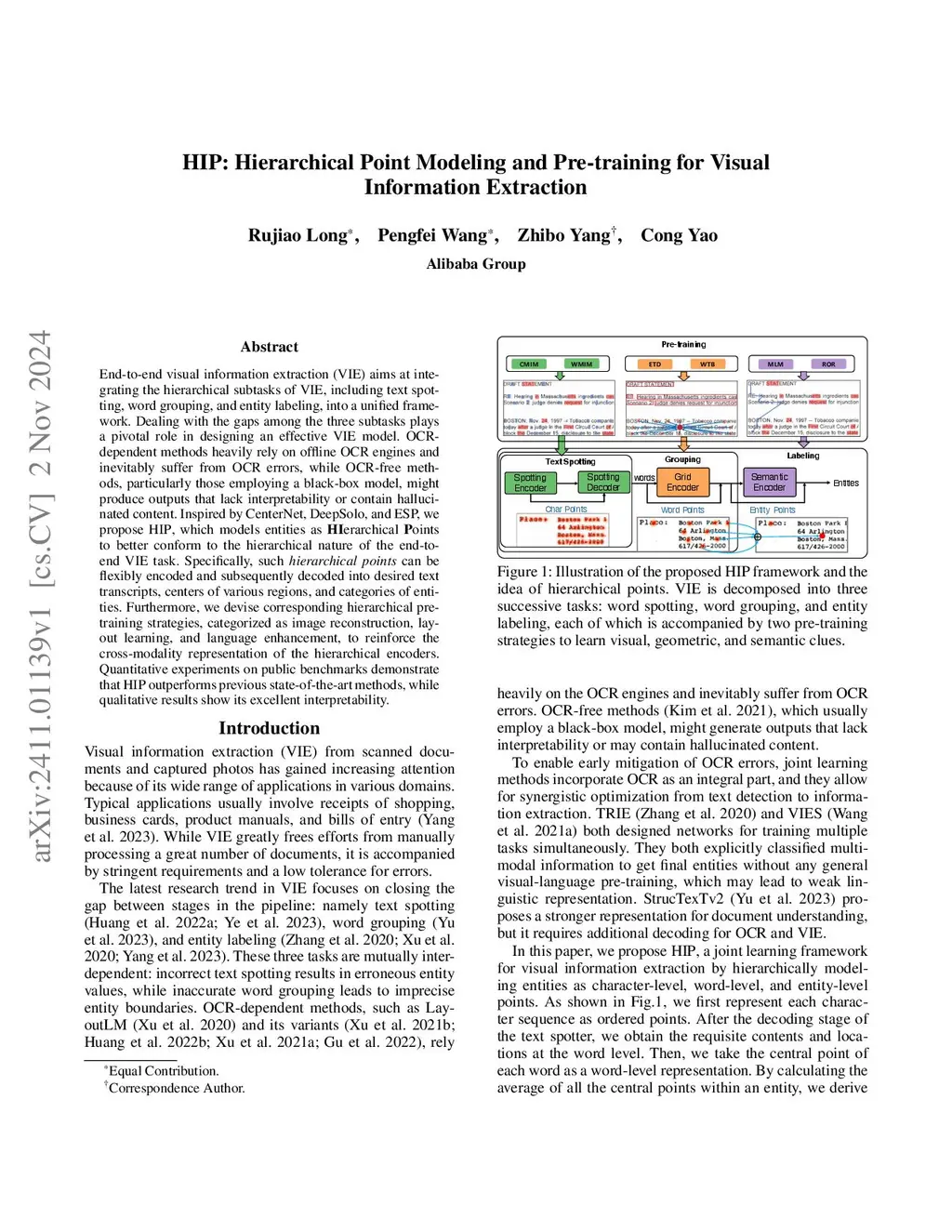 End-to-end visual information extraction (VIE) aims at integrating the hierarchical subtasks of VIE, including text spotting, word grouping, and entity labeling, into a unified framework. Dealing with the gaps among the three subtasks plays a pivotal role in designing an effective VIE model. OCR-dependent methods heavily rely on offline OCR engines and inevitably suffer from OCR errors, while OCR-free methods, particularly those employing a black-box model, might produce outputs that lack interpretability or contain hallucinated content. Inspired by CenterNet, DeepSolo, and ESP, we propose HIP, which models entities as HIerarchical Points to better conform to the hierarchical nature of the end-to-end VIE task. Specifically, such hierarchical points can be flexibly encoded and subsequently decoded into desired text transcripts, centers of various regions, and categories of entities. Furthermore, we devise corresponding hierarchical pre-training strategies, categorized as image reconstruction, layout learning, and language enhancement, to reinforce the cross-modality representation of the hierarchical encoders. Quantitative experiments on public benchmarks demonstrate that HIP outperforms previous state-of-the-art methods, while qualitative results show its excellent interpretability.