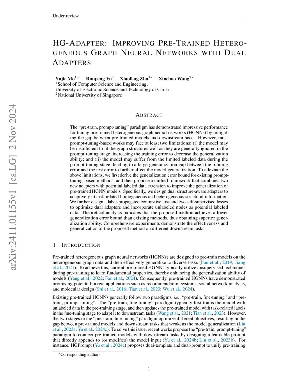 The "pre-train, prompt-tuning'' paradigm has demonstrated impressive performance for tuning pre-trained heterogeneous graph neural networks (HGNNs) by mitigating the gap between pre-trained models and downstream tasks. However, most prompt-tuning-based works may face at least two limitations: (i) the model may be insufficient to fit the graph structures well as they are generally ignored in the prompt-tuning stage, increasing the training error to decrease the generalization ability; and (ii) the model may suffer from the limited labeled data during the prompt-tuning stage, leading to a large generalization gap between the training error and the test error to further affect the model generalization. To alleviate the above limitations, we first derive the generalization error bound for existing prompt-tuning-based methods, and then propose a unified framework that combines two new adapters with potential labeled data extension to improve the generalization of pre-trained HGNN models. Specifically, we design dual structure-aware adapters to adaptively fit task-related homogeneous and heterogeneous structural information. We further design a label-propagated contrastive loss and two self-supervised losses to optimize dual adapters and incorporate unlabeled nodes as potential labeled data. Theoretical analysis indicates that the proposed method achieves a lower generalization error bound than existing methods, thus obtaining superior generalization ability. Comprehensive experiments demonstrate the effectiveness and generalization of the proposed method on different downstream tasks.