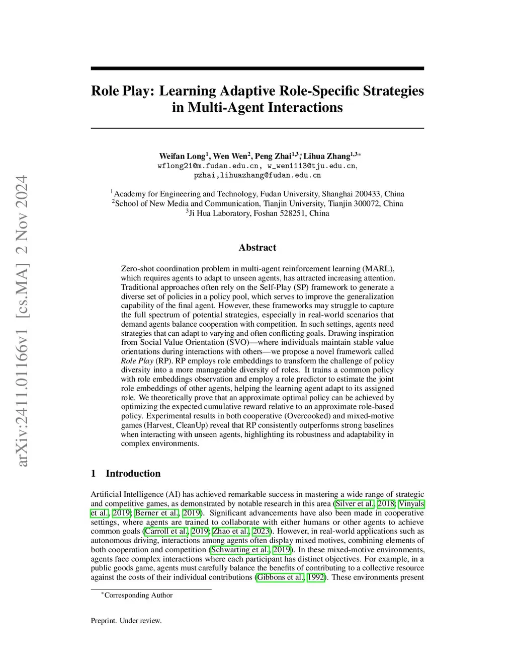 Zero-shot coordination problem in multi-agent reinforcement learning (MARL), which requires agents to adapt to unseen agents, has attracted increasing attention. Traditional approaches often rely on the Self-Play (SP) framework to generate a diverse set of policies in a policy pool, which serves to improve the generalization capability of the final agent. However, these frameworks may struggle to capture the full spectrum of potential strategies, especially in real-world scenarios that demand agents balance cooperation with competition. In such settings, agents need strategies that can adapt to varying and often conflicting goals. Drawing inspiration from Social Value Orientation (SVO)-where individuals maintain stable value orientations during interactions with others-we propose a novel framework called \emph{Role Play} (RP). RP employs role embeddings to transform the challenge of policy diversity into a more manageable diversity of roles. It trains a common policy with role embedding observations and employs a role predictor to estimate the joint role embeddings of other agents, helping the learning agent adapt to its assigned role. We theoretically prove that an approximate optimal policy can be achieved by optimizing the expected cumulative reward relative to an approximate role-based policy. Experimental results in both cooperative (Overcooked) and mixed-motive games (Harvest, CleanUp) reveal that RP consistently outperforms strong baselines when interacting with unseen agents, highlighting its robustness and adaptability in complex environments.