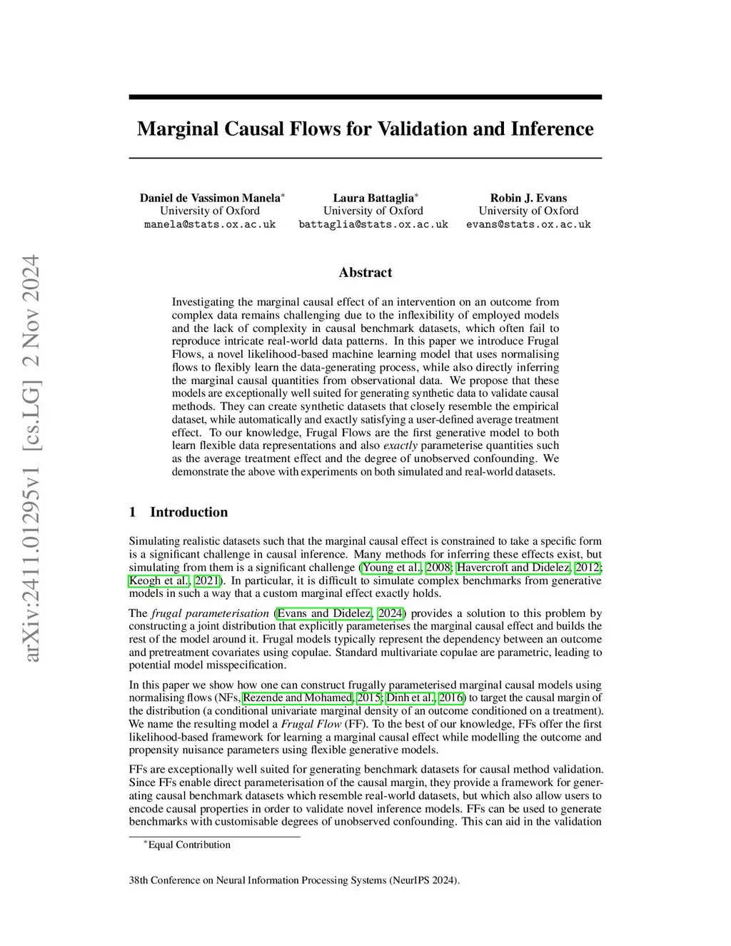 Investigating the marginal causal effect of an intervention on an outcome from complex data remains challenging due to the inflexibility of employed models and the lack of complexity in causal benchmark datasets, which often fail to reproduce intricate real-world data patterns. In this paper we introduce Frugal Flows, a novel likelihood-based machine learning model that uses normalising flows to flexibly learn the data-generating process, while also directly inferring the marginal causal quantities from observational data. We propose that these models are exceptionally well suited for generating synthetic data to validate causal methods. They can create synthetic datasets that closely resemble the empirical dataset, while automatically and exactly satisfying a user-defined average treatment effect. To our knowledge, Frugal Flows are the first generative model to both learn flexible data representations and also exactly parameterise quantities such as the average treatment effect and the degree of unobserved confounding. We demonstrate the above with experiments on both simulated and real-world datasets.