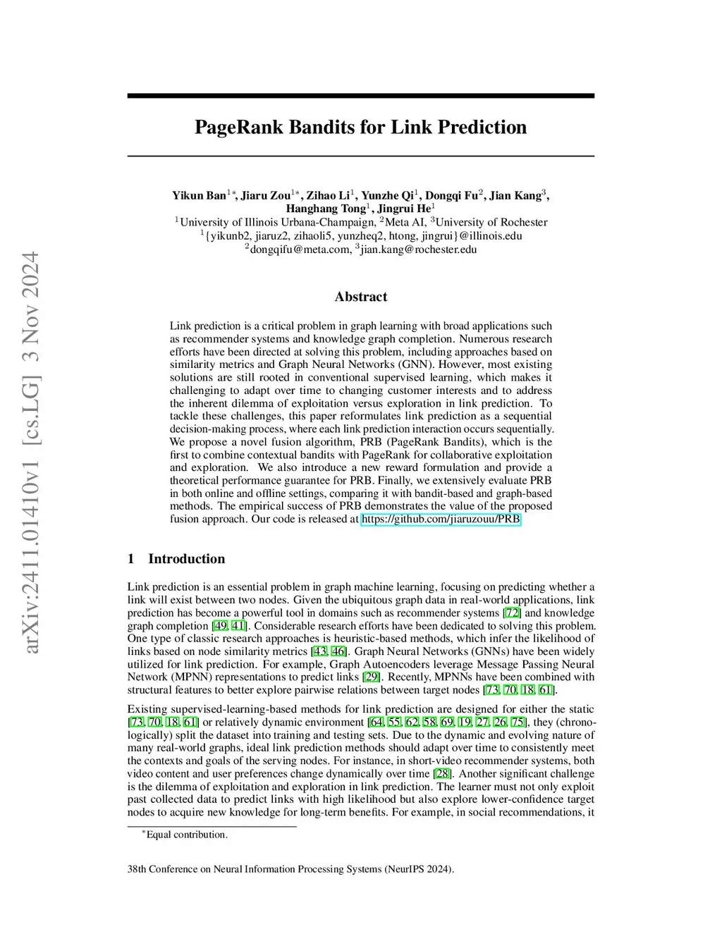 Link prediction is a critical problem in graph learning with broad applications such as recommender systems and knowledge graph completion. Numerous research efforts have been directed at solving this problem, including approaches based on similarity metrics and Graph Neural Networks (GNN). However, most existing solutions are still rooted in conventional supervised learning, which makes it challenging to adapt over time to changing customer interests and to address the inherent dilemma of exploitation versus exploration in link prediction. To tackle these challenges, this paper reformulates link prediction as a sequential decision-making process, where each link prediction interaction occurs sequentially. We propose a novel fusion algorithm, PRB (PageRank Bandits), which is the first to combine contextual bandits with PageRank for collaborative exploitation and exploration. We also introduce a new reward formulation and provide a theoretical performance guarantee for PRB. Finally, we extensively evaluate PRB in both online and offline settings, comparing it with bandit-based and graph-based methods. The empirical success of PRB demonstrates the value of the proposed fusion approach. Our code is released at https://github.com/jiaruzouu/PRB.