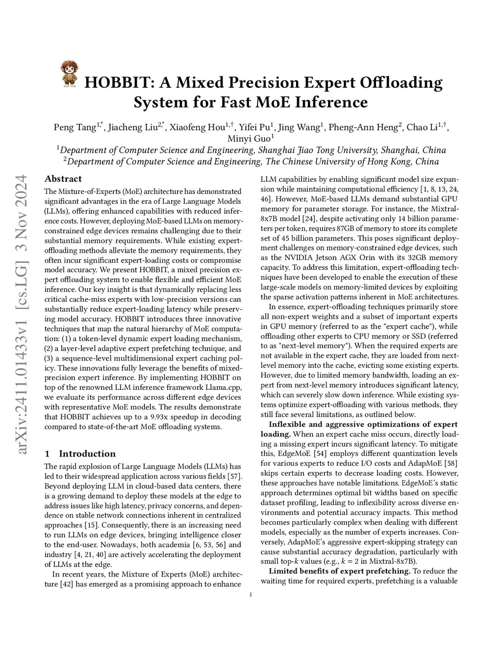 The Mixture-of-Experts (MoE) architecture has demonstrated significant advantages in the era of Large Language Models (LLMs), offering enhanced capabilities with reduced inference costs. However, deploying MoE-based LLMs on memoryconstrained edge devices remains challenging due to their substantial memory requirements. While existing expertoffloading methods alleviate the memory requirements, they often incur significant expert-loading costs or compromise model accuracy. We present HOBBIT, a mixed precision expert offloading system to enable flexible and efficient MoE inference. Our key insight is that dynamically replacing less critical cache-miss experts with low precision versions can substantially reduce expert-loading latency while preserving model accuracy. HOBBIT introduces three innovative techniques that map the natural hierarchy of MoE computation: (1) a token-level dynamic expert loading mechanism, (2) a layer-level adaptive expert prefetching technique, and (3) a sequence-level multidimensional expert caching policy. These innovations fully leverage the benefits of mixedprecision expert inference. By implementing HOBBIT on top of the renowned LLM inference framework Llama.cpp, we evaluate its performance across different edge devices with representative MoE models. The results demonstrate that HOBBIT achieves up to a 9.93x speedup in decoding compared to state-of-the-art MoE offloading systems.