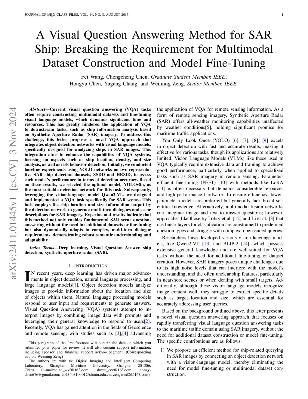 Current visual question answering (VQA) tasks often require constructing multimodal datasets and fine-tuning visual language models, which demands significant time and resources. This has greatly hindered the application of VQA to downstream tasks, such as ship information analysis based on Synthetic Aperture Radar (SAR) imagery. To address this challenge, this letter proposes a novel VQA approach that integrates object detection networks with visual language models, specifically designed for analyzing ships in SAR images. This integration aims to enhance the capabilities of VQA systems, focusing on aspects such as ship location, density, and size analysis, as well as risk behavior detection. Initially, we conducted baseline experiments using YOLO networks on two representative SAR ship detection datasets, SSDD and HRSID, to assess each model's performance in terms of detection accuracy. Based on these results, we selected the optimal model, YOLOv8n, as the most suitable detection network for this task. Subsequently, leveraging the vision-language model Qwen2-VL, we designed and implemented a VQA task specifically for SAR scenes. This task employs the ship location and size information output by the detection network to generate multi-turn dialogues and scene descriptions for SAR imagery. Experimental results indicate that this method not only enables fundamental SAR scene question-answering without the need for additional datasets or fine-tuning but also dynamically adapts to complex, multi-turn dialogue requirements, demonstrating robust semantic understanding and adaptability.