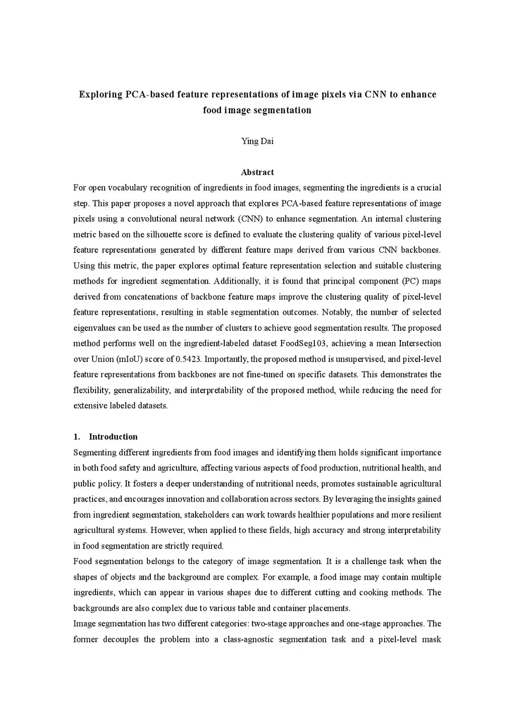 For open vocabulary recognition of ingredients in food images, segmenting the ingredients is a crucial step. This paper proposes a novel approach that explores PCA-based feature representations of image pixels using a convolutional neural network (CNN) to enhance segmentation. An internal clustering metric based on the silhouette score is defined to evaluate the clustering quality of various pixel-level feature representations generated by different feature maps derived from various CNN backbones. Using this metric, the paper explores optimal feature representation selection and suitable clustering methods for ingredient segmentation. Additionally, it is found that principal component (PC) maps derived from concatenations of backbone feature maps improve the clustering quality of pixel-level feature representations, resulting in stable segmentation outcomes. Notably, the number of selected eigenvalues can be used as the number of clusters to achieve good segmentation results. The proposed method performs well on the ingredient-labeled dataset FoodSeg103, achieving a mean Intersection over Union (mIoU) score of 0.5423. Importantly, the proposed method is unsupervised, and pixel-level feature representations from backbones are not fine-tuned on specific datasets. This demonstrates the flexibility, generalizability, and interpretability of the proposed method, while reducing the need for extensive labeled datasets.