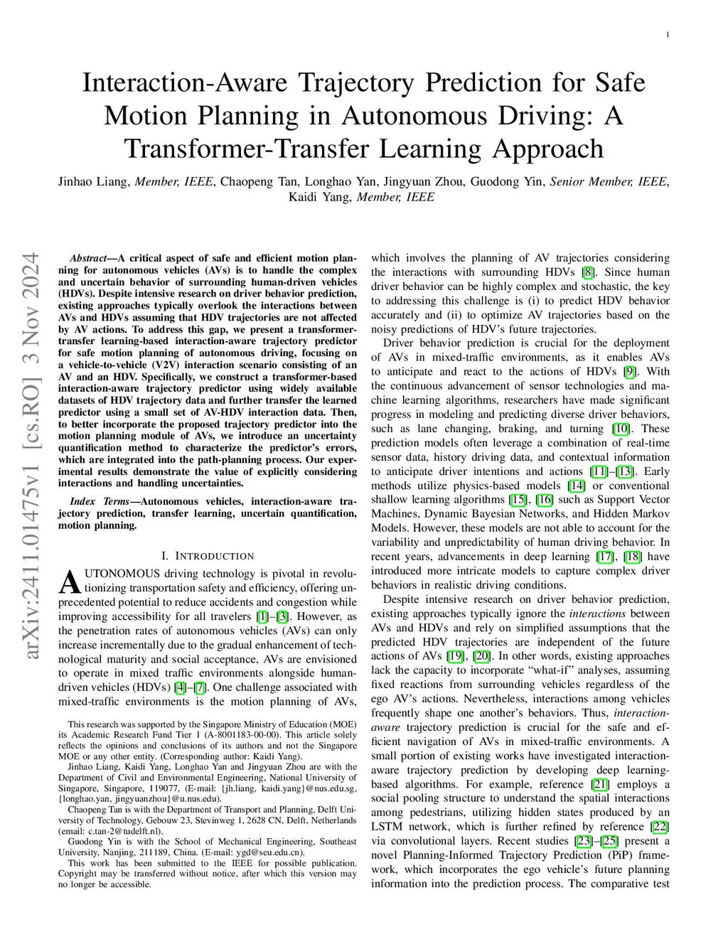 A critical aspect of safe and efficient motion planning for autonomous vehicles (AVs) is to handle the complex and uncertain behavior of surrounding human-driven vehicles (HDVs). Despite intensive research on driver behavior prediction, existing approaches typically overlook the interactions between AVs and HDVs assuming that HDV trajectories are not affected by AV actions. To address this gap, we present a transformer-transfer learning-based interaction-aware trajectory predictor for safe motion planning of autonomous driving, focusing on a vehicle-to-vehicle (V2V) interaction scenario consisting of an AV and an HDV. Specifically, we construct a transformer-based interaction-aware trajectory predictor using widely available datasets of HDV trajectory data and further transfer the learned predictor using a small set of AV-HDV interaction data. Then, to better incorporate the proposed trajectory predictor into the motion planning module of AVs, we introduce an uncertainty quantification method to characterize the errors of the predictor, which are integrated into the path-planning process. Our experimental results demonstrate the value of explicitly considering interactions and handling uncertainties.