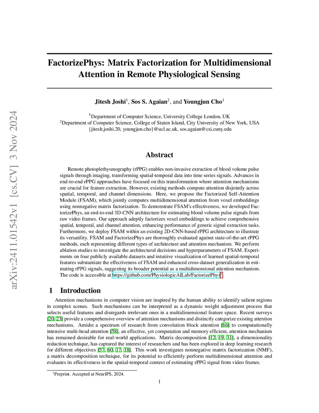 Remote photoplethysmography (rPPG) enables non-invasive extraction of blood volume pulse signals through imaging, transforming spatial-temporal data into time series signals. Advances in end-to-end rPPG approaches have focused on this transformation where attention mechanisms are crucial for feature extraction. However, existing methods compute attention disjointly across spatial, temporal, and channel dimensions. Here, we propose the Factorized Self-Attention Module (FSAM), which jointly computes multidimensional attention from voxel embeddings using nonnegative matrix factorization. To demonstrate FSAM's effectiveness, we developed FactorizePhys, an end-to-end 3D-CNN architecture for estimating blood volume pulse signals from raw video frames. Our approach adeptly factorizes voxel embeddings to achieve comprehensive spatial, temporal, and channel attention, enhancing performance of generic signal extraction tasks. Furthermore, we deploy FSAM within an existing 2D-CNN-based rPPG architecture to illustrate its versatility. FSAM and FactorizePhys are thoroughly evaluated against state-of-the-art rPPG methods, each representing different types of architecture and attention mechanism. We perform ablation studies to investigate the architectural decisions and hyperparameters of FSAM. Experiments on four publicly available datasets and intuitive visualization of learned spatial-temporal features substantiate the effectiveness of FSAM and enhanced cross-dataset generalization in estimating rPPG signals, suggesting its broader potential as a multidimensional attention mechanism. The code is accessible at https://github.com/PhysiologicAILab/FactorizePhys.