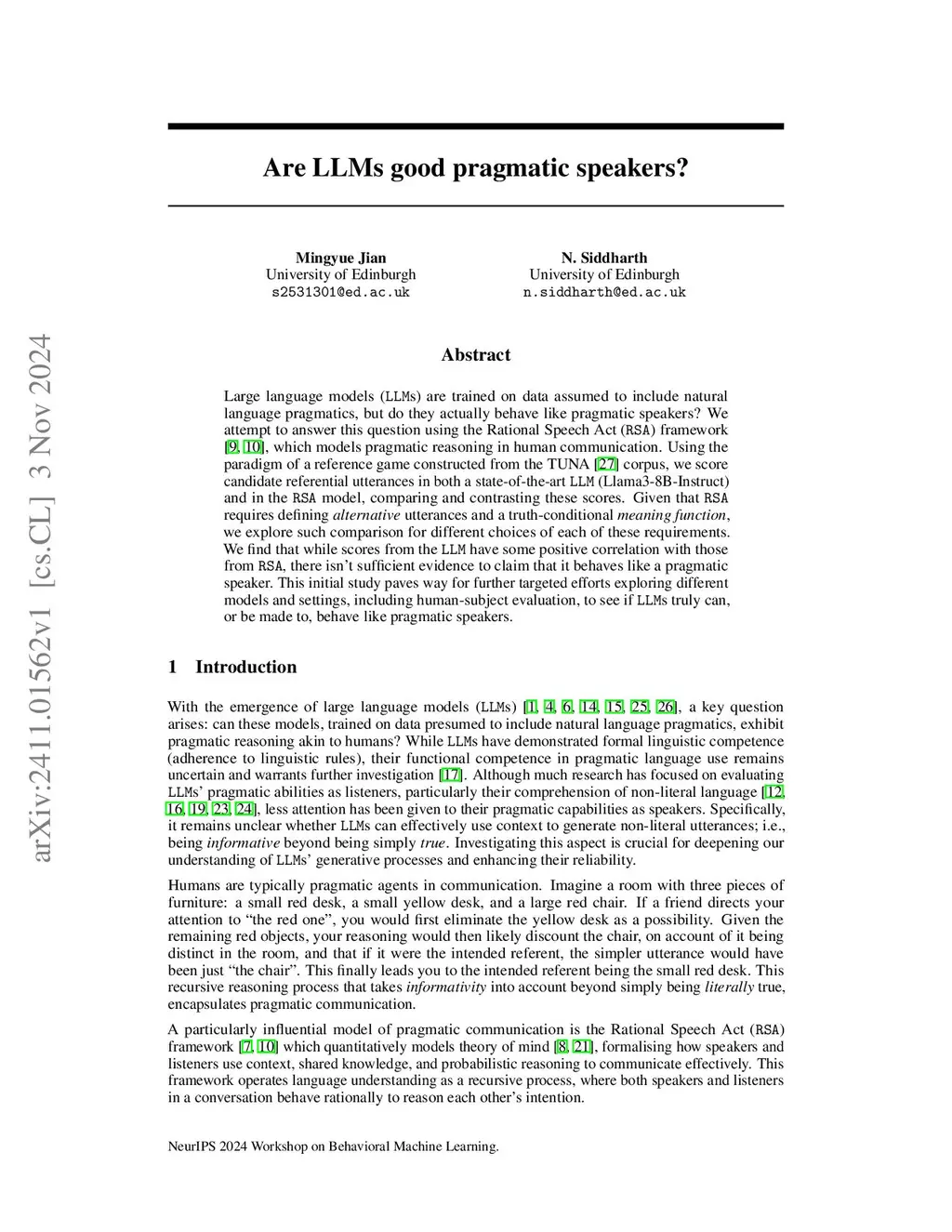 Large language models (LLMs) are trained on data assumed to include natural language pragmatics, but do they actually behave like pragmatic speakers? We attempt to answer this question using the Rational Speech Act (RSA) framework, which models pragmatic reasoning in human communication. Using the paradigm of a reference game constructed from the TUNA corpus, we score candidate referential utterances in both a state-of-the-art LLM (Llama3-8B-Instruct) and in the RSA model, comparing and contrasting these scores. Given that RSA requires defining alternative utterances and a truth-conditional meaning function, we explore such comparison for different choices of each of these requirements. We find that while scores from the LLM have some positive correlation with those from RSA, there isn't sufficient evidence to claim that it behaves like a pragmatic speaker. This initial study paves way for further targeted efforts exploring different models and settings, including human-subject evaluation, to see if LLMs truly can, or be made to, behave like pragmatic speakers.