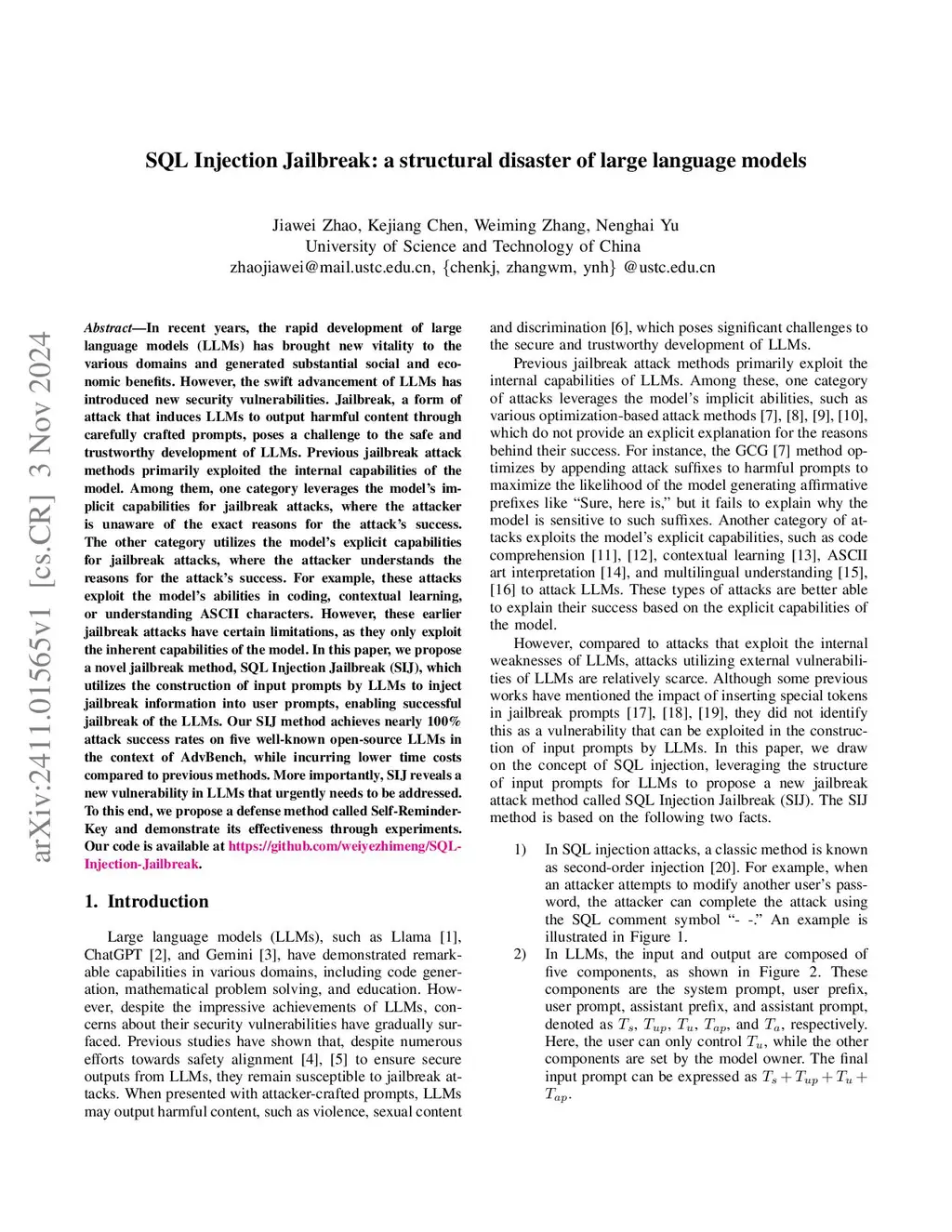 In recent years, the rapid development of large language models (LLMs) has brought new vitality into various domains, generating substantial social and economic benefits. However, jailbreaking, a form of attack that induces LLMs to produce harmful content through carefully crafted prompts, presents a significant challenge to the safe and trustworthy development of LLMs. Previous jailbreak methods primarily exploited the internal properties or capabilities of LLMs, such as optimization-based jailbreak methods and methods that leveraged the model's context-learning abilities. In this paper, we introduce a novel jailbreak method, SQL Injection Jailbreak (SIJ), which targets the external properties of LLMs, specifically, the way LLMs construct input prompts. By injecting jailbreak information into user prompts, SIJ successfully induces the model to output harmful content. For open-source models, SIJ achieves near 100\% attack success rates on five well-known LLMs on the AdvBench and HEx-PHI, while incurring lower time costs compared to previous methods. For closed-source models, SIJ achieves an average attack success rate over 85\% across five models in the GPT and Doubao series. Additionally, SIJ exposes a new vulnerability in LLMs that urgently requires mitigation. To address this, we propose a simple defense method called Self-Reminder-Key to counter SIJ and demonstrate its effectiveness through experimental results. Our code is available atthis https URL.