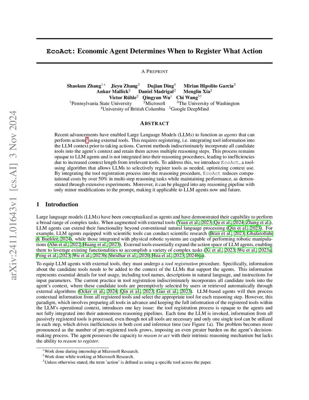 Recent advancements have enabled Large Language Models (LLMs) to function as agents that can perform actions using external tools. This requires registering, i.e., integrating tool information into the LLM context prior to taking actions. Current methods indiscriminately incorporate all candidate tools into the agent's context and retain them across multiple reasoning steps. This process remains opaque to LLM agents and is not integrated into their reasoning procedures, leading to inefficiencies due to increased context length from irrelevant tools. To address this, we introduce EcoAct, a tool using algorithm that allows LLMs to selectively register tools as needed, optimizing context use. By integrating the tool registration process into the reasoning procedure, EcoAct reduces computational costs by over 50% in multiple steps reasoning tasks while maintaining performance, as demonstrated through extensive experiments. Moreover, it can be plugged into any reasoning pipeline with only minor modifications to the prompt, making it applicable to LLM agents now and future.