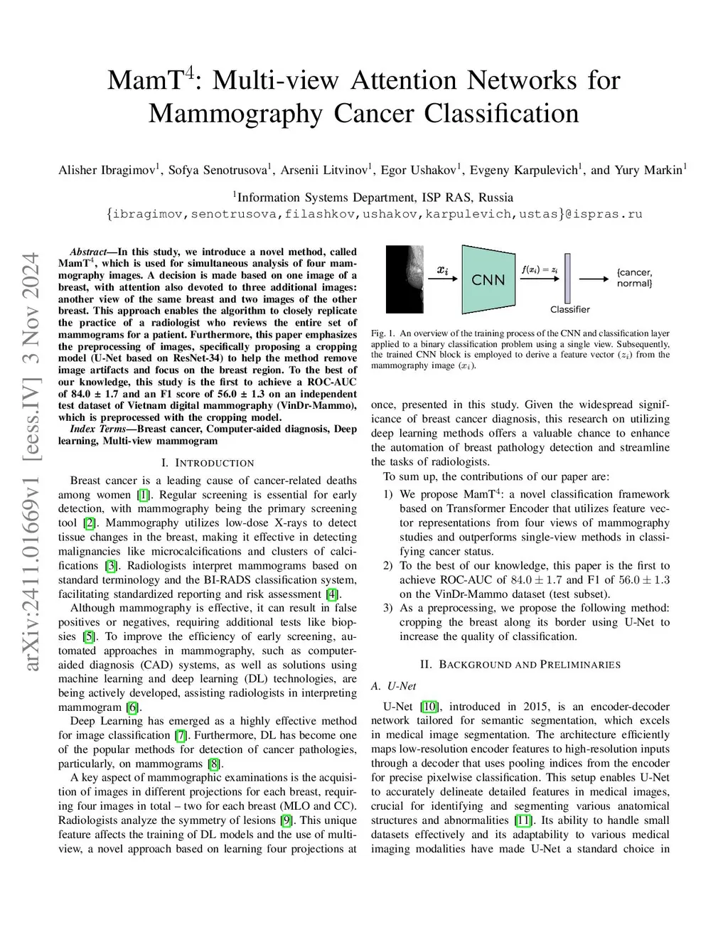 In this study, we introduce a novel method, called MamT, which is used for simultaneous analysis of four mammography images. A decision is made based on one image of a breast, with attention also devoted to three additional images: another view of the same breast and two images of the other breast. This approach enables the algorithm to closely replicate the practice of a radiologist who reviews the entire set of mammograms for a patient. Furthermore, this paper emphasizes the preprocessing of images, specifically proposing a cropping model (U-Net based on ResNet-34) to help the method remove image artifacts and focus on the breast region. To the best of our knowledge, this study is the first to achieve a ROC-AUC of 84.0 1.7 and an F1 score of 56.0 1.3 on an independent test dataset of Vietnam digital mammography (VinDr-Mammo), which is preprocessed with the cropping model.