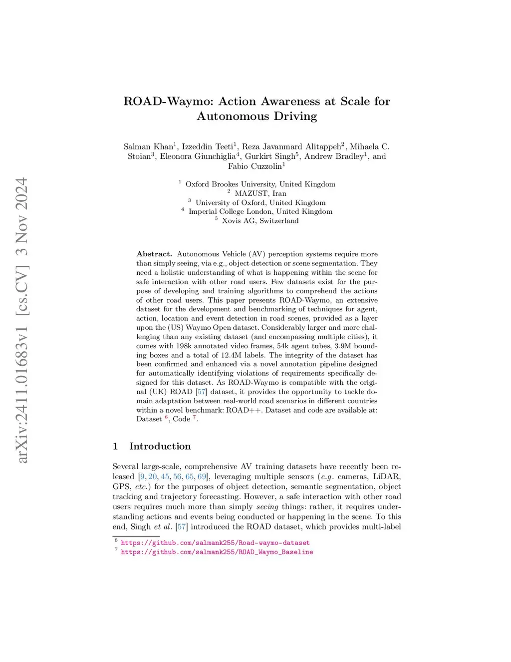 Autonomous Vehicle (AV) perception systems require more than simply seeing, via e.g., object detection or scene segmentation. They need a holistic understanding of what is happening within the scene for safe interaction with other road users. Few datasets exist for the purpose of developing and training algorithms to comprehend the actions of other road users. This paper presents ROAD-Waymo, an extensive dataset for the development and benchmarking of techniques for agent, action, location and event detection in road scenes, provided as a layer upon the (US) Waymo Open dataset. Considerably larger and more challenging than any existing dataset (and encompassing multiple cities), it comes with 198k annotated video frames, 54k agent tubes, 3.9M bounding boxes and a total of 12.4M labels. The integrity of the dataset has been confirmed and enhanced via a novel annotation pipeline designed for automatically identifying violations of requirements specifically designed for this dataset. As ROAD-Waymo is compatible with the original (UK) ROAD dataset, it provides the opportunity to tackle domain adaptation between real-world road scenarios in different countries within a novel benchmark: ROAD++.