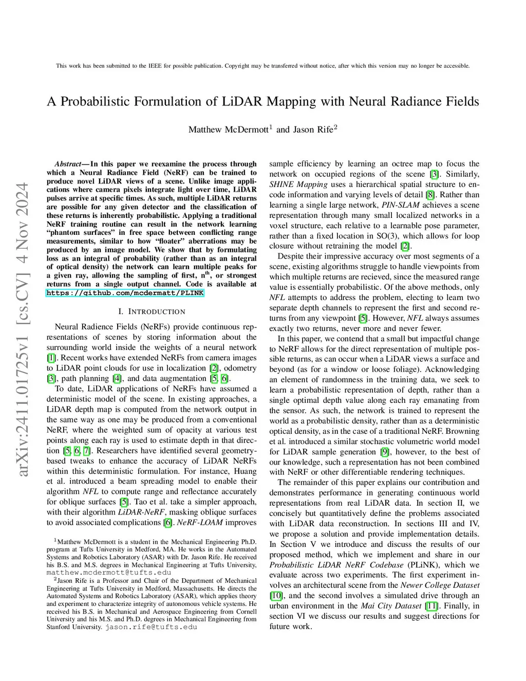 In this paper we reexamine the process through which a Neural Radiance Field (NeRF) can be trained to produce novel LiDAR views of a scene. Unlike image applications where camera pixels integrate light over time, LiDAR pulses arrive at specific times. As such, multiple LiDAR returns are possible for any given detector and the classification of these returns is inherently probabilistic. Applying a traditional NeRF training routine can result in the network learning phantom surfaces in free space between conflicting range measurements, similar to how floater aberrations may be produced by an image model. We show that by formulating loss as an integral of probability (rather than as an integral of optical density) the network can learn multiple peaks for a given ray, allowing the sampling of first, nth, or strongest returns from a single output channel. Code is available at https://github.com/mcdermatt/PLINK