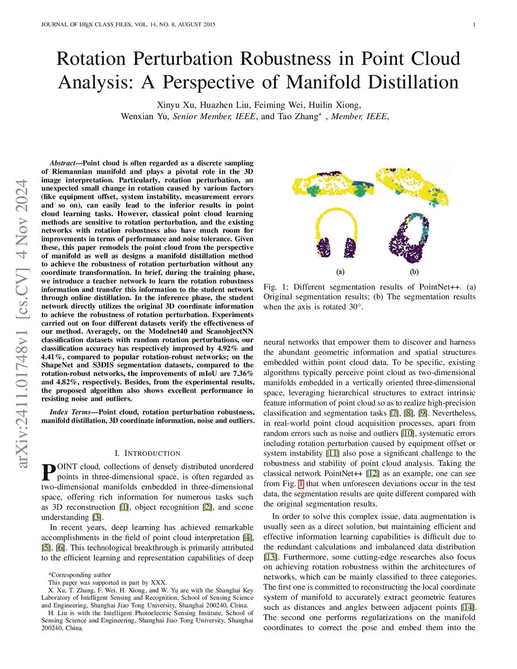 Point cloud is often regarded as a discrete sampling of Riemannian manifold and plays a pivotal role in the 3D image interpretation. Particularly, rotation perturbation, an unexpected small change in rotation caused by various factors (like equipment offset, system instability, measurement errors and so on), can easily lead to the inferior results in point cloud learning tasks. However, classical point cloud learning methods are sensitive to rotation perturbation, and the existing networks with rotation robustness also have much room for improvements in terms of performance and noise tolerance. Given these, this paper remodels the point cloud from the perspective of manifold as well as designs a manifold distillation method to achieve the robustness of rotation perturbation without any coordinate transformation. In brief, during the training phase, we introduce a teacher network to learn the rotation robustness information and transfer this information to the student network through online distillation. In the inference phase, the student network directly utilizes the original 3D coordinate information to achieve the robustness of rotation perturbation. Experiments carried out on four different datasets verify the effectiveness of our method. Averagely, on the Modelnet40 and ScanobjectNN classification datasets with random rotation perturbations, our classification accuracy has respectively improved by 4.92% and 4.41%, compared to popular rotation-robust networks; on the ShapeNet and S3DIS segmentation datasets, compared to the rotation-robust networks, the improvements of mIoU are 7.36% and 4.82%, respectively. Besides, from the experimental results, the proposed algorithm also shows excellent performance in resisting noise and outliers.