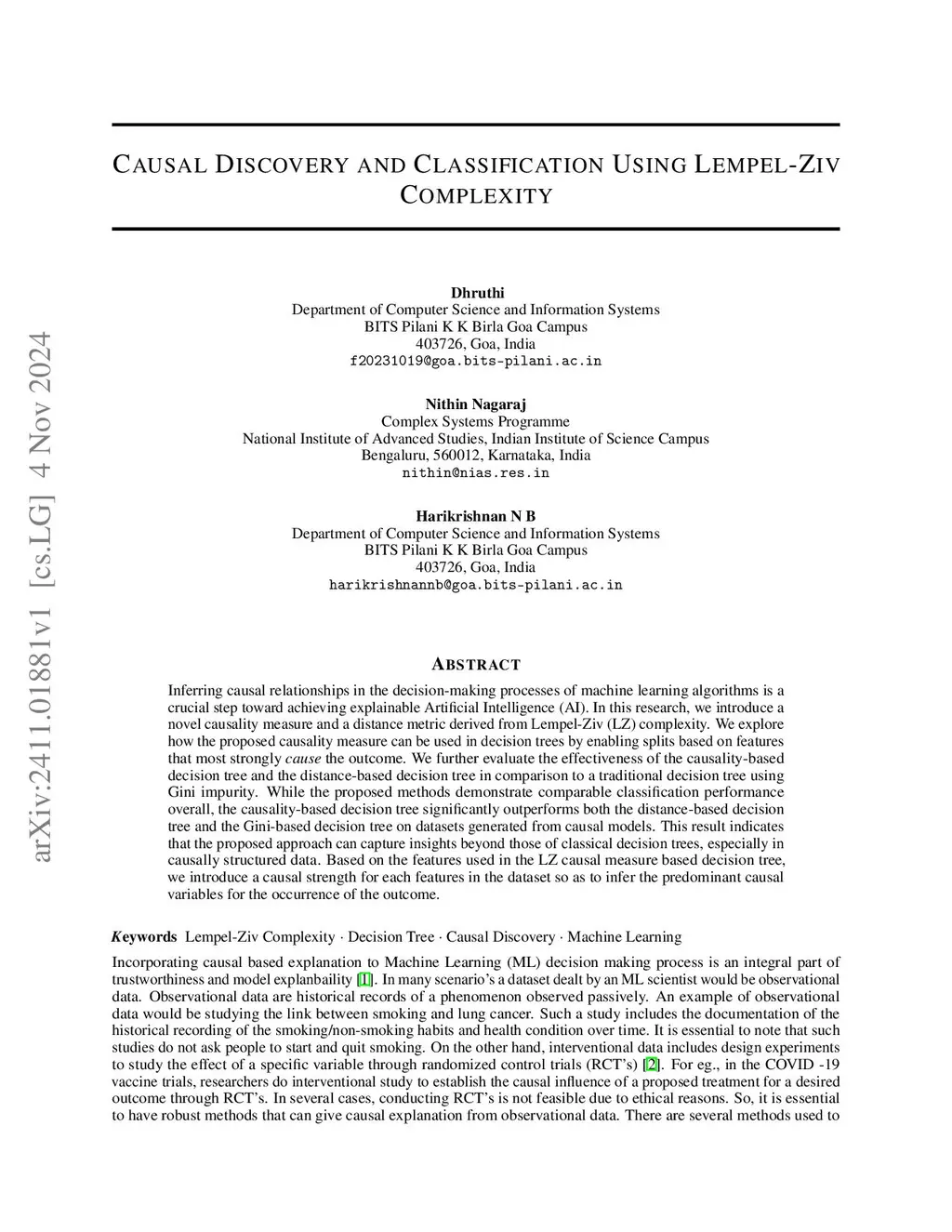 Inferring causal relationships in the decision-making processes of machine learning algorithms is a crucial step toward achieving explainable Artificial Intelligence (AI). In this research, we introduce a novel causality measure and a distance metric derived from Lempel-Ziv (LZ) complexity. We explore how the proposed causality measure can be used in decision trees by enabling splits based on features that most strongly \textit{cause} the outcome. We further evaluate the effectiveness of the causality-based decision tree and the distance-based decision tree in comparison to a traditional decision tree using Gini impurity. While the proposed methods demonstrate comparable classification performance overall, the causality-based decision tree significantly outperforms both the distance-based decision tree and the Gini-based decision tree on datasets generated from causal models. This result indicates that the proposed approach can capture insights beyond those of classical decision trees, especially in causally structured data. Based on the features used in the LZ causal measure based decision tree, we introduce a causal strength for each features in the dataset so as to infer the predominant causal variables for the occurrence of the outcome.