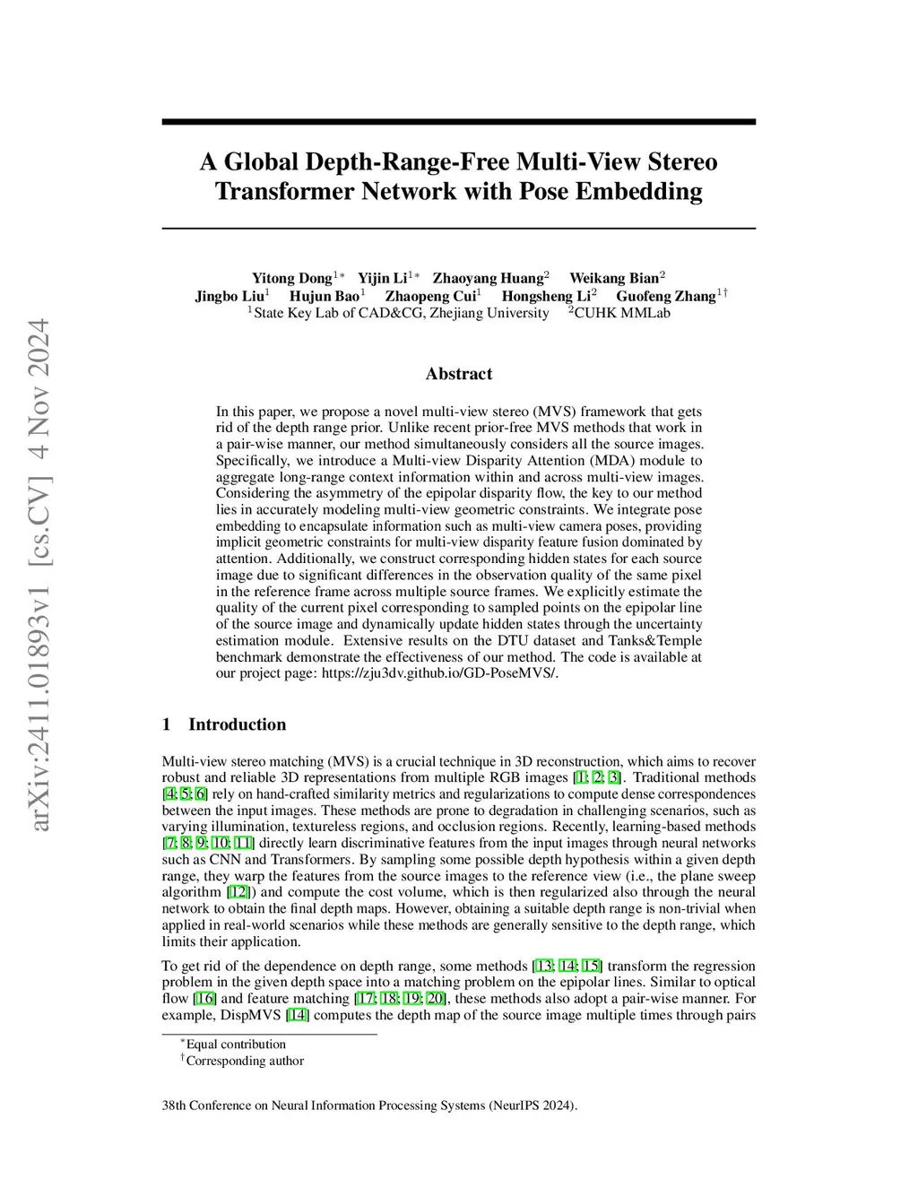 In this paper, we propose a novel multi-view stereo (MVS) framework that gets rid of the depth range prior. Unlike recent prior-free MVS methods that work in a pair-wise manner, our method simultaneously considers all the source images. Specifically, we introduce a Multi-view Disparity Attention (MDA) module to aggregate long-range context information within and across multi-view images. Considering the asymmetry of the epipolar disparity flow, the key to our method lies in accurately modeling multi-view geometric constraints. We integrate pose embedding to encapsulate information such as multi-view camera poses, providing implicit geometric constraints for multi-view disparity feature fusion dominated by attention. Additionally, we construct corresponding hidden states for each source image due to significant differences in the observation quality of the same pixel in the reference frame across multiple source frames. We explicitly estimate the quality of the current pixel corresponding to sampled points on the epipolar line of the source image and dynamically update hidden states through the uncertainty estimation module. Extensive results on the DTU dataset and Tanks&Temple benchmark demonstrate the effectiveness of our method. The code is available at our project page: https://zju3dv.github.io/GD-PoseMVS/.