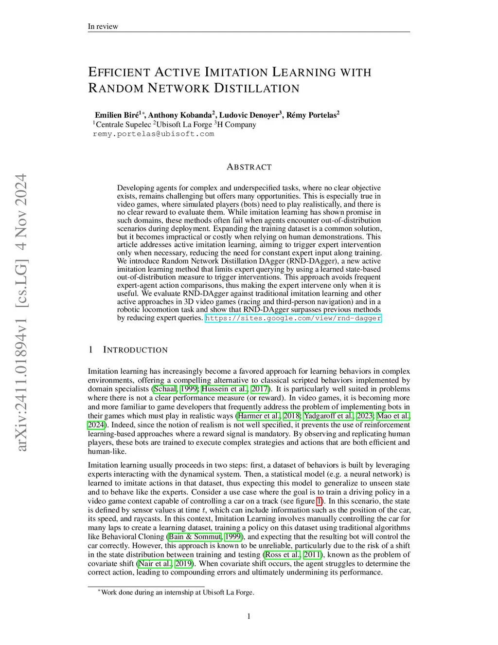 Developing agents for complex and underspecified tasks, where no clear objective exists, remains challenging but offers many opportunities. This is especially true in video games, where simulated players (bots) need to play realistically, and there is no clear reward to evaluate them. While imitation learning has shown promise in such domains, these methods often fail when agents encounter out-of-distribution scenarios during deployment. Expanding the training dataset is a common solution, but it becomes impractical or costly when relying on human demonstrations. This article addresses active imitation learning, aiming to trigger expert intervention only when necessary, reducing the need for constant expert input along training. We introduce Random Network Distillation DAgger (RND-DAgger), a new active imitation learning method that limits expert querying by using a learned state-based out-of-distribution measure to trigger interventions. This approach avoids frequent expert-agent action comparisons, thus making the expert intervene only when it is useful. We evaluate RND-DAgger against traditional imitation learning and other active approaches in 3D video games (racing and third-person navigation) and in a robotic locomotion task and show that RND-DAgger surpasses previous methods by reducing expert queries.this https URL