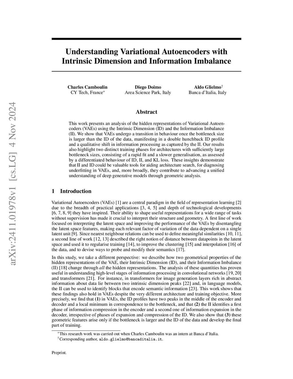 This work presents an analysis of the hidden representations of Variational Autoencoders (VAEs) using the Intrinsic Dimension (ID) and the Information Imbalance (II). We show that VAEs undergo a transition in behaviour once the bottleneck size is larger than the ID of the data, manifesting in a double hunchback ID profile and a qualitative shift in information processing as captured by the II. Our results also highlight two distinct training phases for architectures with sufficiently large bottleneck sizes, consisting of a rapid fit and a slower generalisation, as assessed by a differentiated behaviour of ID, II, and KL loss. These insights demonstrate that II and ID could be valuable tools for aiding architecture search, for diagnosing underfitting in VAEs, and, more broadly, they contribute to advancing a unified understanding of deep generative models through geometric analysis.