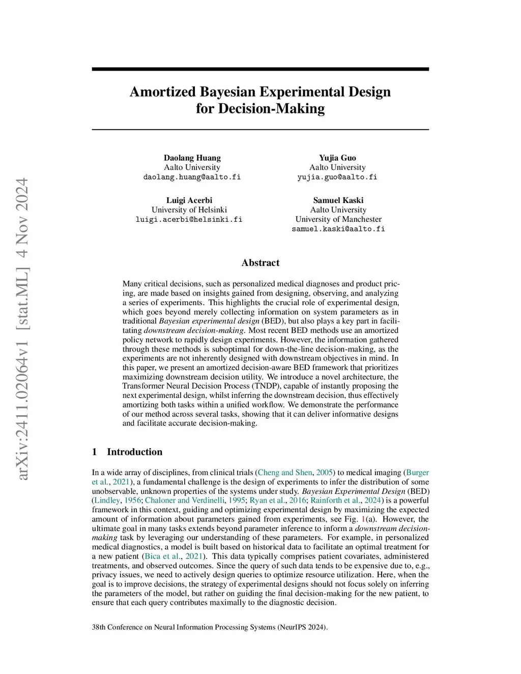 Many critical decisions, such as personalized medical diagnoses and product pricing, are made based on insights gained from designing, observing, and analyzing a series of experiments. This highlights the crucial role of experimental design, which goes beyond merely collecting information on system parameters as in traditional Bayesian experimental design (BED), but also plays a key part in facilitating downstream decision-making. Most recent BED methods use an amortized policy network to rapidly design experiments. However, the information gathered through these methods is suboptimal for down-the-line decision-making, as the experiments are not inherently designed with downstream objectives in mind. In this paper, we present an amortized decision-aware BED framework that prioritizes maximizing downstream decision utility. We introduce a novel architecture, the Transformer Neural Decision Process (TNDP), capable of instantly proposing the next experimental design, whilst inferring the downstream decision, thus effectively amortizing both tasks within a unified workflow. We demonstrate the performance of our method across several tasks, showing that it can deliver informative designs and facilitate accurate decision-making.