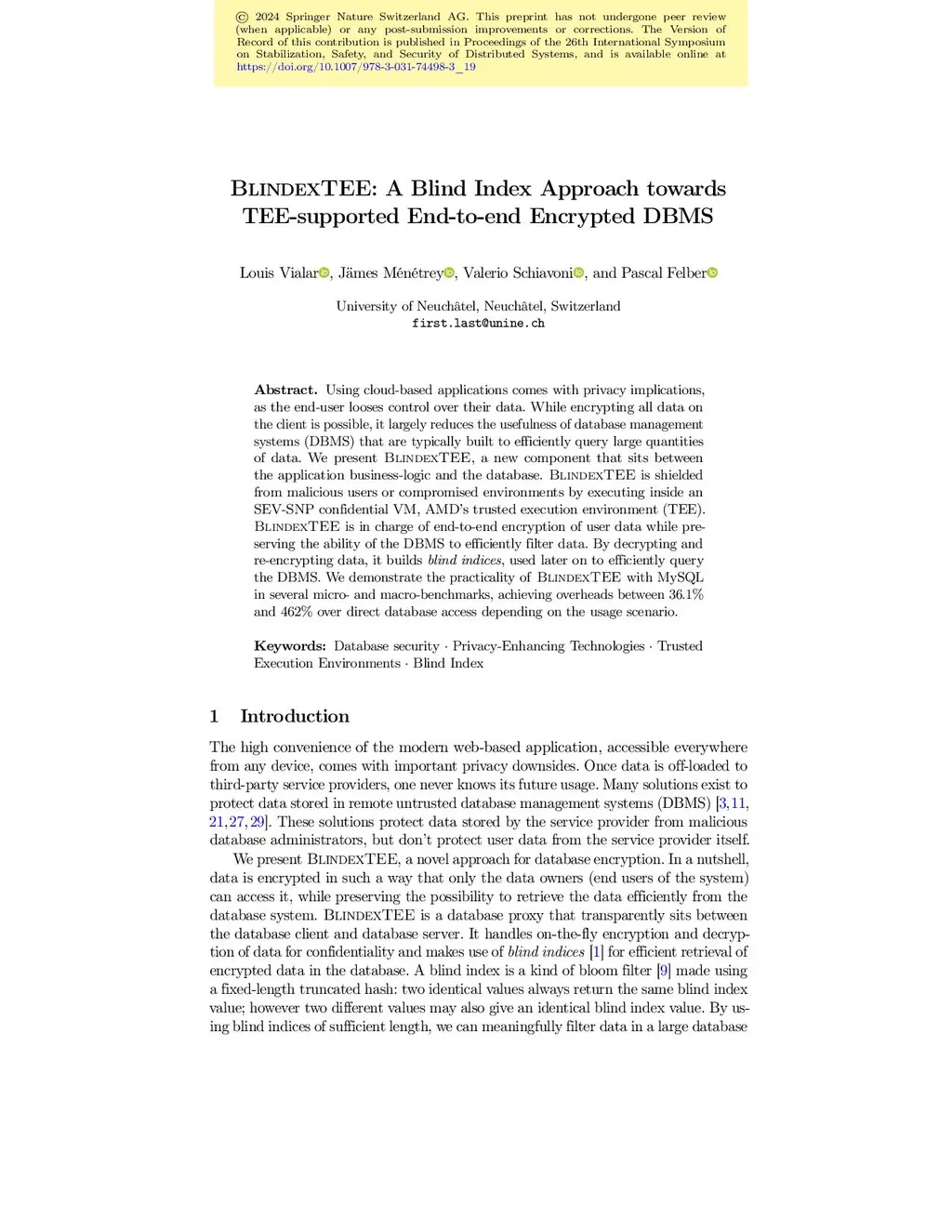 Using cloud-based applications comes with privacy implications, as the end-user looses control over their data. While encrypting all data on the client is possible, it largely reduces the usefulness of database management systems (DBMS) that are typically built to efficiently query large quantities of data. We present BlindexTEE, a new component that sits between the application business-logic and the database. BlindexTEE is shielded from malicious users or compromised environments by executing inside an SEV-SNP confidential VM, AMD's trusted execution environment (TEE). BlindexTEE is in charge of end-to-end encryption of user data while preserving the ability of the DBMS to efficiently filter data. By decrypting and re-encrypting data, it builds blind indices, used later on to efficiently query the DBMS. We demonstrate the practicality of BlindexTEE with MySQL in several micro- and macro-benchmarks, achieving overheads between 36.1% and 462% over direct database access depending on the usage scenario.