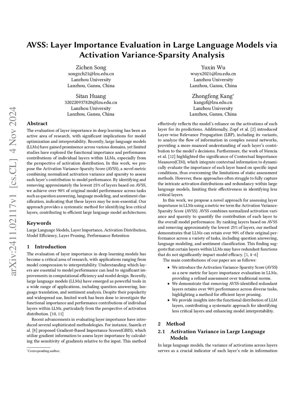 The evaluation of layer importance in deep learning has been an active area of research, with significant implications for model optimization and interpretability. Recently, large language models (LLMs) have gained prominence across various domains, yet limited studies have explored the functional importance and performance contributions of individual layers within LLMs, especially from the perspective of activation distribution. In this work, we propose the Activation Variance-Sparsity Score (AVSS), a novel metric combining normalized activation variance and sparsity to assess each layer's contribution to model performance. By identifying and removing approximately the lowest 25% of layers based on AVSS, we achieve over 90% of original model performance across tasks such as question answering, language modeling, and sentiment classification, indicating that these layers may be non-essential. Our approach provides a systematic method for identifying less critical layers, contributing to efficient large language model architectures.