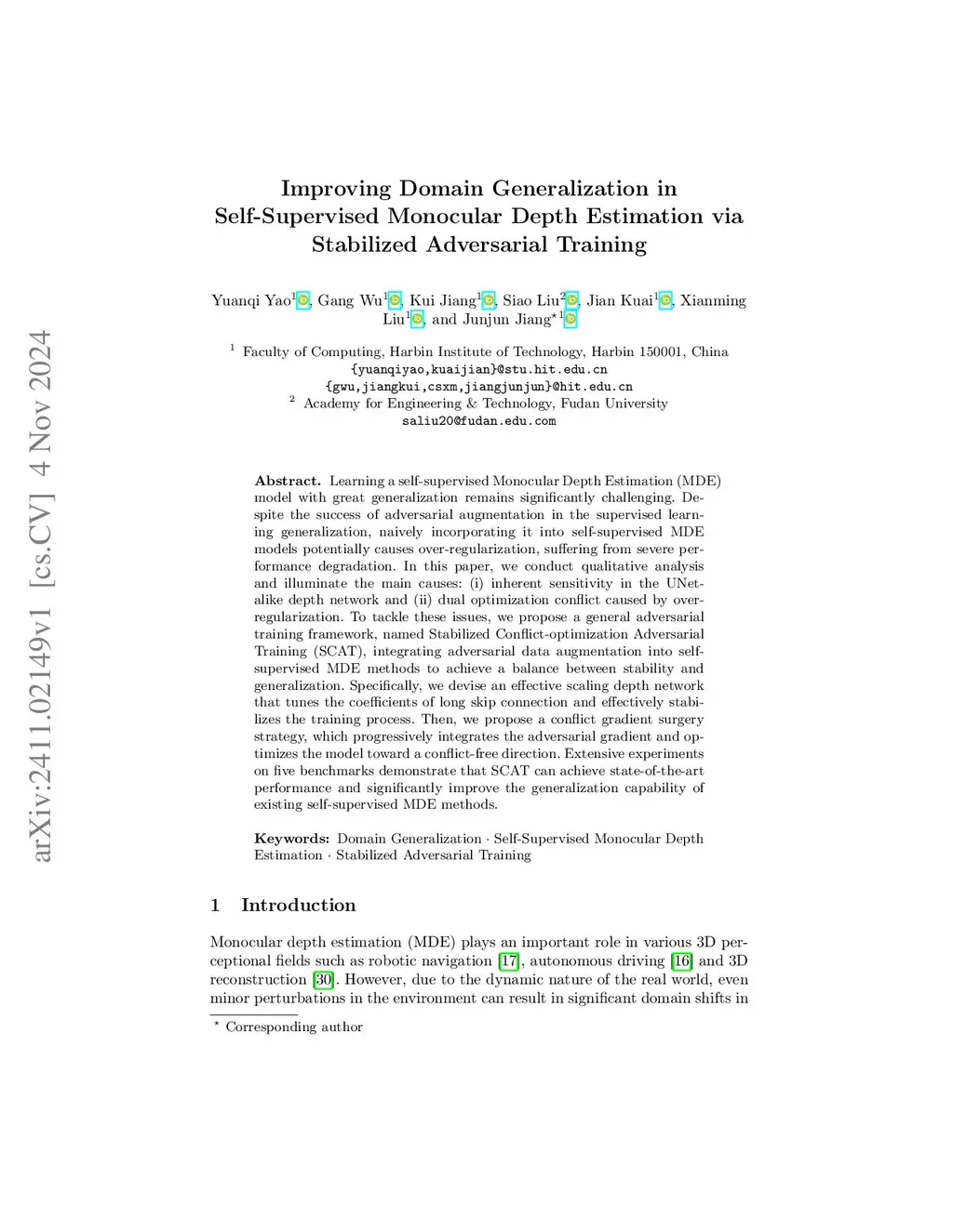 Learning a self-supervised Monocular Depth Estimation (MDE) model with great generalization remains significantly challenging. Despite the success of adversarial augmentation in the supervised learning generalization, naively incorporating it into self-supervised MDE models potentially causes over-regularization, suffering from severe performance degradation. In this paper, we conduct qualitative analysis and illuminate the main causes: (i) inherent sensitivity in the UNet-alike depth network and (ii) dual optimization conflict caused by over-regularization. To tackle these issues, we propose a general adversarial training framework, named Stabilized Conflict-optimization Adversarial Training (SCAT), integrating adversarial data augmentation into self-supervised MDE methods to achieve a balance between stability and generalization. Specifically, we devise an effective scaling depth network that tunes the coefficients of long skip connection and effectively stabilizes the training process. Then, we propose a conflict gradient surgery strategy, which progressively integrates the adversarial gradient and optimizes the model toward a conflict-free direction. Extensive experiments on five benchmarks demonstrate that SCAT can achieve state-of-the-art performance and significantly improve the generalization capability of existing self-supervised MDE methods.