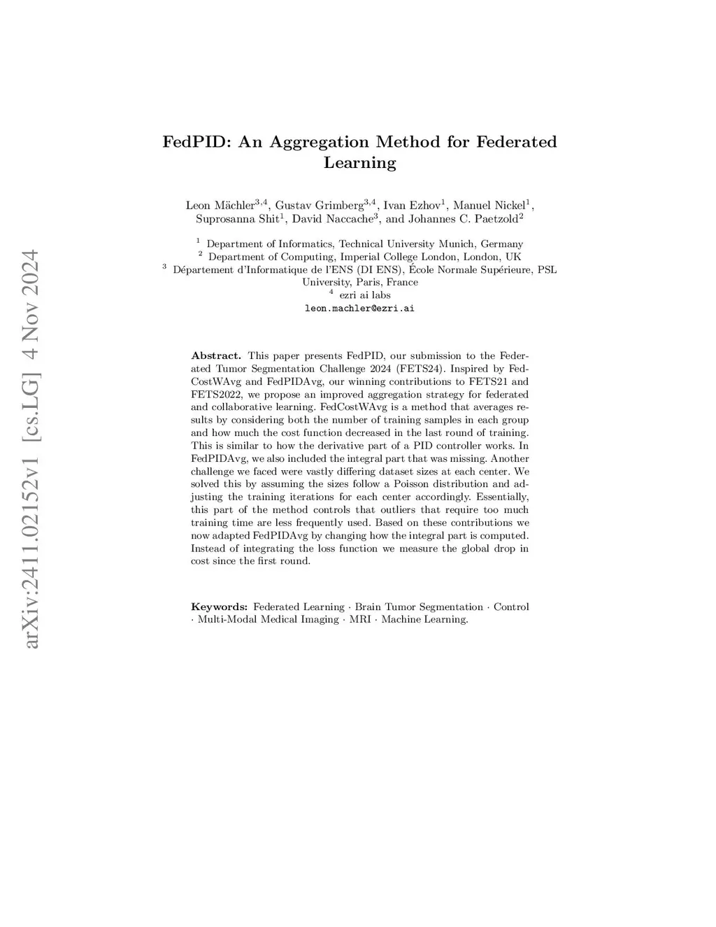 This paper presents FedPID, our submission to the Federated Tumor Segmentation Challenge 2024 (FETS24). Inspired by FedCostWAvg and FedPIDAvg, our winning contributions to FETS21 and FETS2022, we propose an improved aggregation strategy for federated and collaborative learning. FedCostWAvg is a method that averages results by considering both the number of training samples in each group and how much the cost function decreased in the last round of training. This is similar to how the derivative part of a PID controller works. In FedPIDAvg, we also included the integral part that was missing. Another challenge we faced were vastly differing dataset sizes at each center. We solved this by assuming the sizes follow a Poisson distribution and adjusting the training iterations for each center accordingly. Essentially, this part of the method controls that outliers that require too much training time are less frequently used. Based on these contributions we now adapted FedPIDAvg by changing how the integral part is computed. Instead of integrating the loss function we measure the global drop in cost since the first round.