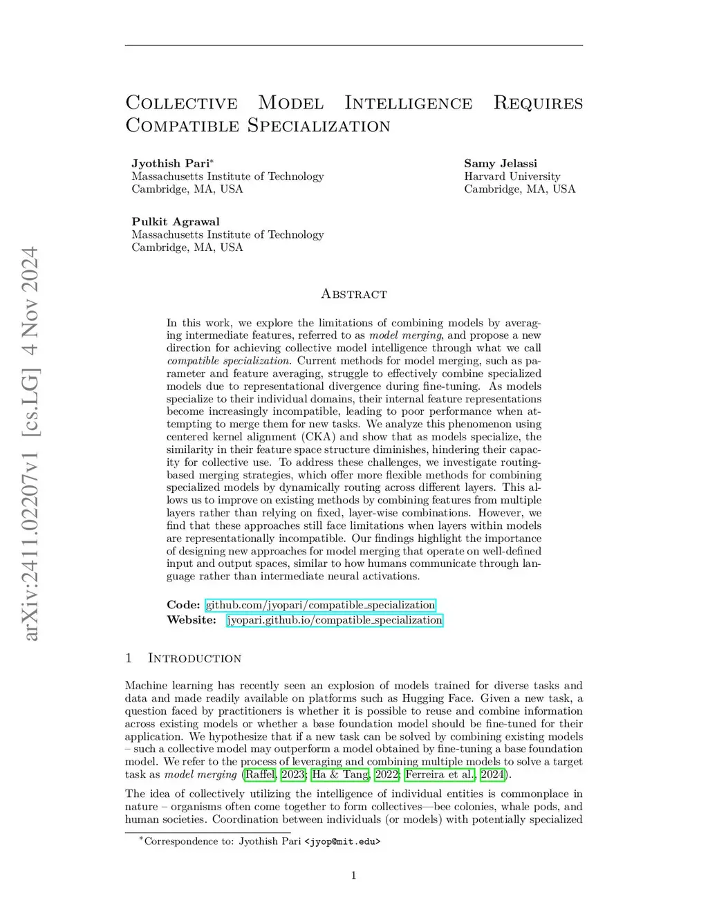 In this work, we explore the limitations of combining models by averaging intermediate features, referred to as model merging, and propose a new direction for achieving collective model intelligence through what we call compatible specialization. Current methods for model merging, such as parameter and feature averaging, struggle to effectively combine specialized models due to representational divergence during fine-tuning. As models specialize to their individual domains, their internal feature representations become increasingly incompatible, leading to poor performance when attempting to merge them for new tasks. We analyze this phenomenon using centered kernel alignment (CKA) and show that as models specialize, the similarity in their feature space structure diminishes, hindering their capacity for collective use. To address these challenges, we investigate routing-based merging strategies, which offer more flexible methods for combining specialized models by dynamically routing across different layers. This allows us to improve on existing methods by combining features from multiple layers rather than relying on fixed, layer-wise combinations. However, we find that these approaches still face limitations when layers within models are representationally incompatible. Our findings highlight the importance of designing new approaches for model merging that operate on well-defined input and output spaces, similar to how humans communicate through language rather than intermediate neural activations.