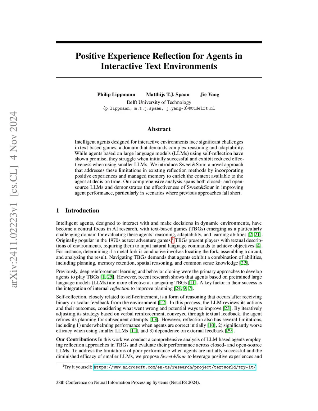 Intelligent agents designed for interactive environments face significant challenges in text-based games, a domain that demands complex reasoning and adaptability. While agents based on large language models (LLMs) using self-reflection have shown promise, they struggle when initially successful and exhibit reduced effectiveness when using smaller LLMs. We introduce Sweet&Sour, a novel approach that addresses these limitations in existing reflection methods by incorporating positive experiences and managed memory to enrich the context available to the agent at decision time. Our comprehensive analysis spans both closed- and open-source LLMs and demonstrates the effectiveness of Sweet&Sour in improving agent performance, particularly in scenarios where previous approaches fall short.