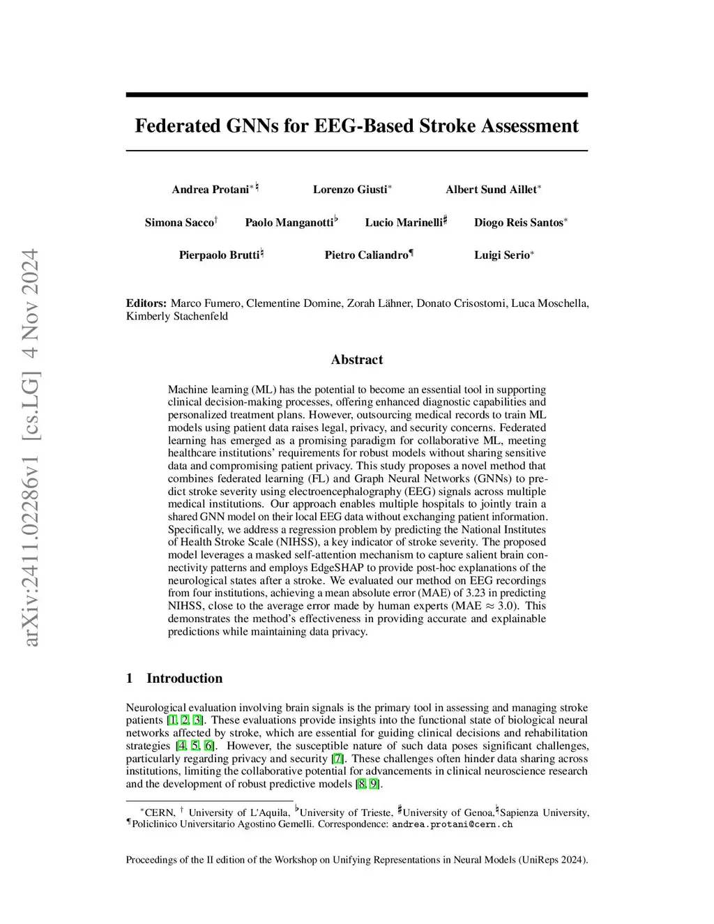 Machine learning (ML) has the potential to become an essential tool in supporting clinical decision-making processes, offering enhanced diagnostic capabilities and personalized treatment plans. However, outsourcing medical records to train ML models using patient data raises legal, privacy, and security concerns. Federated learning has emerged as a promising paradigm for collaborative ML, meeting healthcare institutions' requirements for robust models without sharing sensitive data and compromising patient privacy. This study proposes a novel method that combines federated learning (FL) and Graph Neural Networks (GNNs) to predict stroke severity using electroencephalography (EEG) signals across multiple medical institutions. Our approach enables multiple hospitals to jointly train a shared GNN model on their local EEG data without exchanging patient information. Specifically, we address a regression problem by predicting the National Institutes of Health Stroke Scale (NIHSS), a key indicator of stroke severity. The proposed model leverages a masked self-attention mechanism to capture salient brain connectivity patterns and employs EdgeSHAP to provide post-hoc explanations of the neurological states after a stroke. We evaluated our method on EEG recordings from four institutions, achieving a mean absolute error (MAE) of 3.23 in predicting NIHSS, close to the average error made by human experts (MAE 3.0). This demonstrates the method's effectiveness in providing accurate and explainable predictions while maintaining data privacy.