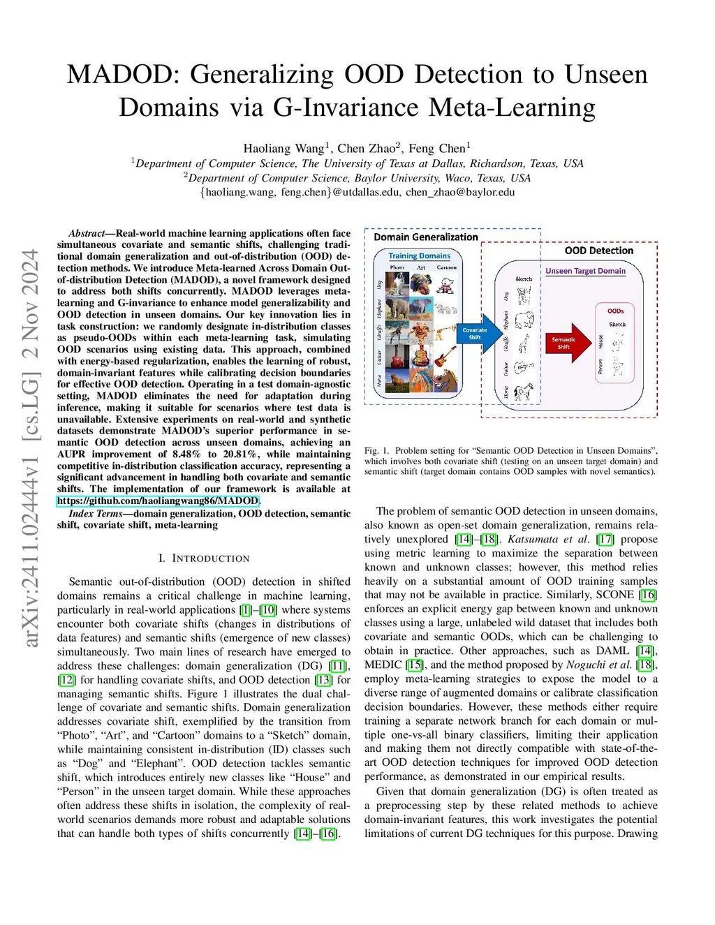 Real-world machine learning applications often face simultaneous covariate and semantic shifts, challenging traditional domain generalization and out-of-distribution (OOD) detection methods. We introduce Meta-learned Across Domain Out-of-distribution Detection (MADOD), a novel framework designed to address both shifts concurrently. MADOD leverages meta-learning and G-invariance to enhance model generalizability and OOD detection in unseen domains. Our key innovation lies in task construction: we randomly designate in-distribution classes as pseudo-OODs within each meta-learning task, simulating OOD scenarios using existing data. This approach, combined with energy-based regularization, enables the learning of robust, domain-invariant features while calibrating decision boundaries for effective OOD detection. Operating in a test domain-agnostic setting, MADOD eliminates the need for adaptation during inference, making it suitable for scenarios where test data is unavailable. Extensive experiments on real-world and synthetic datasets demonstrate MADOD's superior performance in semantic OOD detection across unseen domains, achieving an AUPR improvement of 8.48% to 20.81%, while maintaining competitive in-distribution classification accuracy, representing a significant advancement in handling both covariate and semantic shifts.