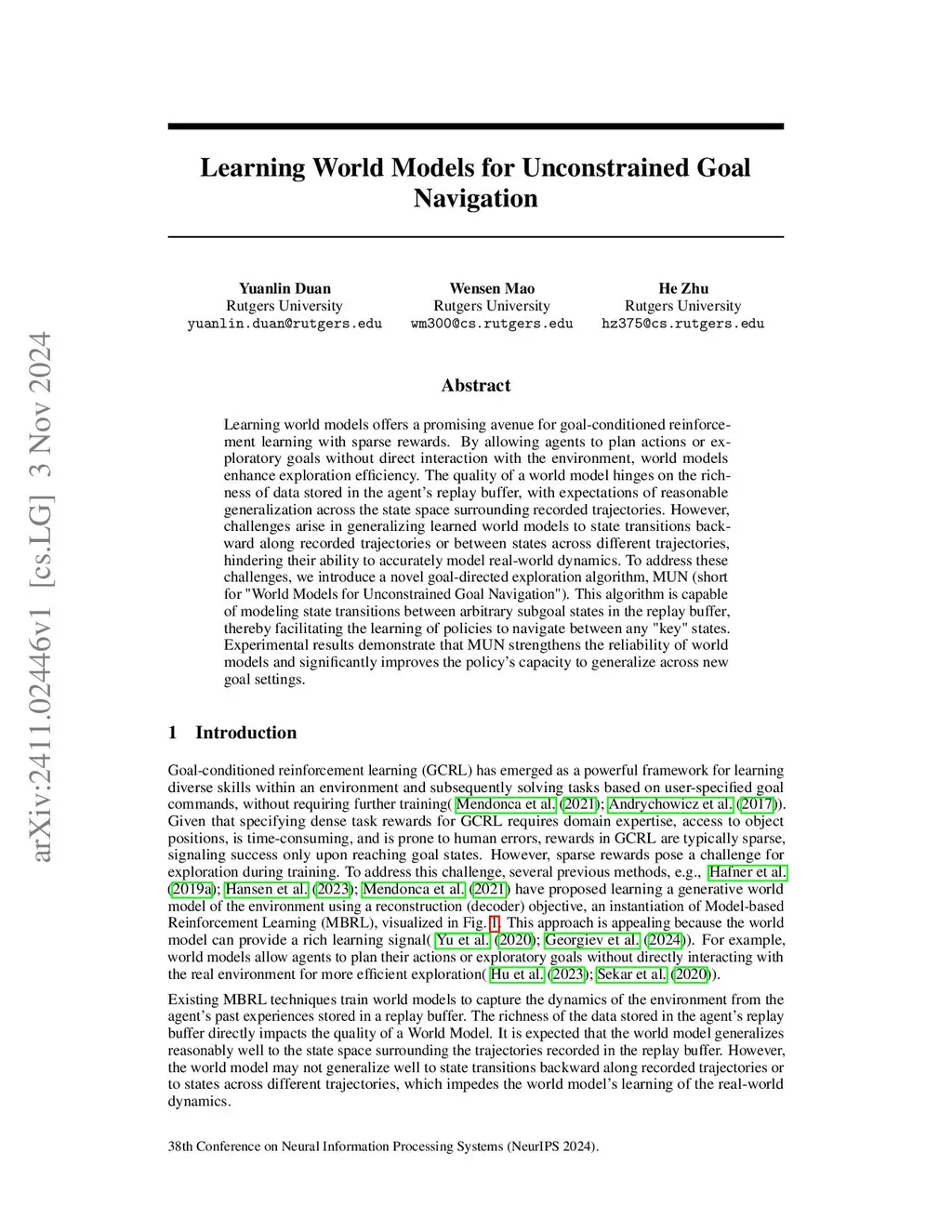 Learning world models offers a promising avenue for goal-conditioned reinforcement learning with sparse rewards. By allowing agents to plan actions or exploratory goals without direct interaction with the environment, world models enhance exploration efficiency. The quality of a world model hinges on the richness of data stored in the agent's replay buffer, with expectations of reasonable generalization across the state space surrounding recorded trajectories. However, challenges arise in generalizing learned world models to state transitions backward along recorded trajectories or between states across different trajectories, hindering their ability to accurately model real-world dynamics. To address these challenges, we introduce a novel goal-directed exploration algorithm, MUN (short for "World Models for Unconstrained Goal Navigation"). This algorithm is capable of modeling state transitions between arbitrary subgoal states in the replay buffer, thereby facilitating the learning of policies to navigate between any "key" states. Experimental results demonstrate that MUN strengthens the reliability of world models and significantly improves the policy's capacity to generalize across new goal settings.