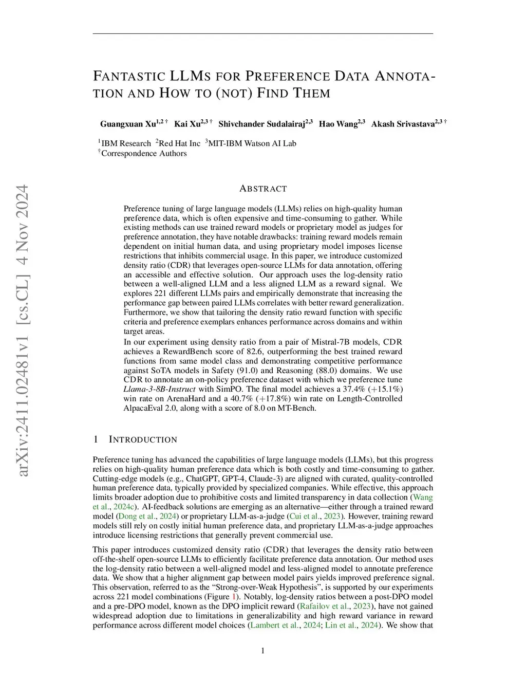 Preference tuning relies on high-quality human preference data, which is often expensive and time-consuming to gather. In this paper, we introducethis http URL(Density Ratio of Strong over Weak) a cost-effective method that eliminates the reliance for human annotation by leveraging off-the-shelf LLMs for preference data annotation.this http URLuses the log-density ratio between a better-aligned and a less-aligned LLM as a reward signal. We evaluatethis http URLacross 221 different LLM pairs and empirically find a strong correlation between the performance gap of the paired models and the quality of the reward signal. This insight provides a practical guideline for selecting LLMs for data annotation.Additionally, we introduce an end-to-end pipeline that customizes reward functions based on user query domains. Without fine-tuning, it improves accuracy on domain-specific evaluations. With a pair of Mistral-7B models,this http URLachieves a RewardBench score of 82.6, outperforming the best trained reward functions from same model class and demonstrating competitive performance against SoTA models in Safety (91.0) and Reasoning (88.0) domains. Further, we preference-tune Llama-3-8B-Instruct using data annotated bythis http URL. Our approach pushes Llama-3-8B to achieve a 37.4 % (+15.1 %) win rate on ArenaHard and a 40.7 % (+17.8 %) win rate on length-controlled AlpacaEval 2.0.